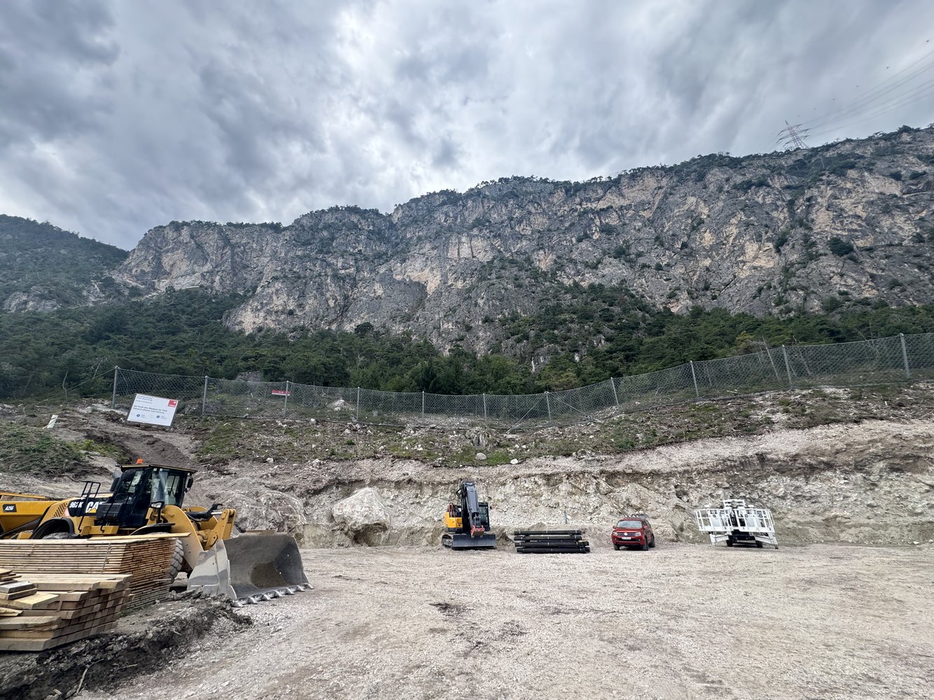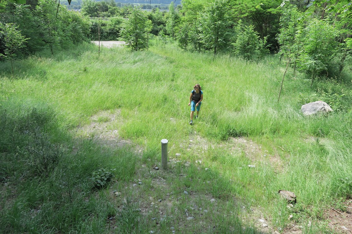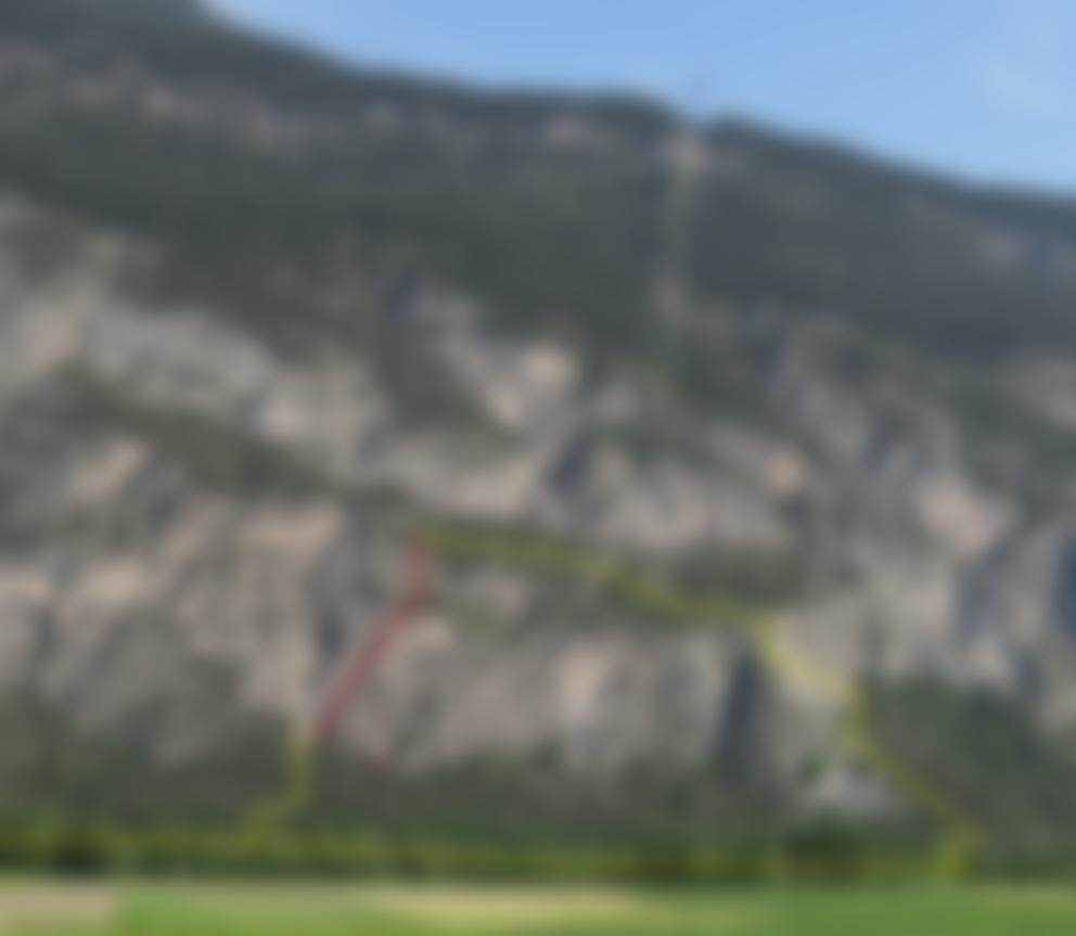 Auf dem Schotterweg auf den Autobahntunnel und dem Schotterweg weiter nach rechts folgen. Bei der ersten Abzweigung (kleine Wiese, Schild Sektor Octopus) nach links in den Wald und auf Steigspuren hinauf zum Einstieg bei der markanten Rampe (Einstieg ist mit Alutafel angeschrieben).