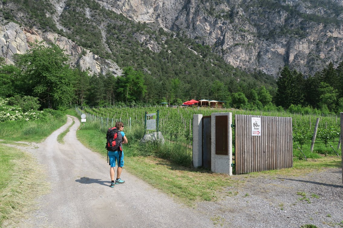 Vom Ausstieg auf Steigspuren nach rechts queren bis man in eine kleine Schuttrinne kommt (schwache orange Markierung auf Stein). Über die Rinne und auf der anderen Seite auf Steigspuren absteigen, dann leicht links zu einer Felskante mit Fixseil (altes Kletterseil). Dem Fixseil entlang, man kommt auf ein weiteres Wiesenstück, dort links (immer von oben gesehen) zum nächsten Fixseil. An diesem quert man auf einem Band absteigend zum Wandfuß (Klettergarten Sandbank). Von dort auf dem blau/orange markierten Pfad zum Schotterweg an der Autobahn. Auf diesem nach rechts zurück zum Parkplatz beim Weinberg.