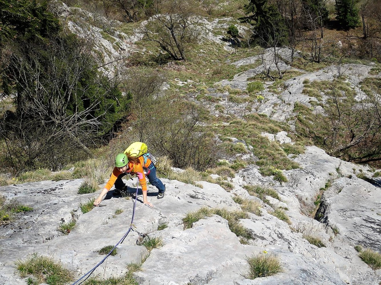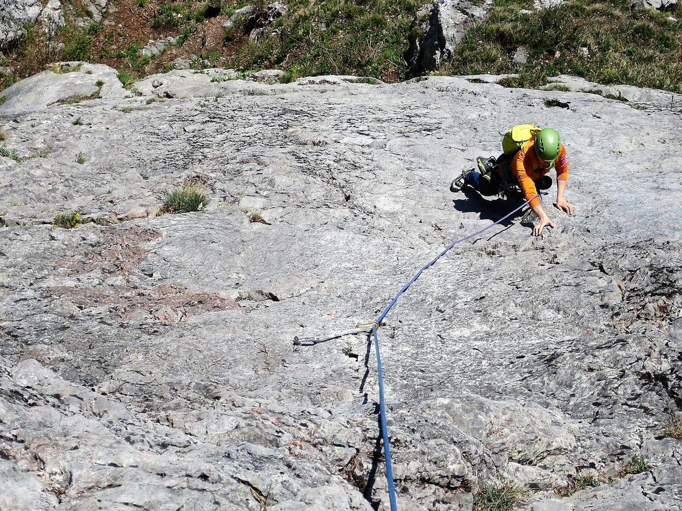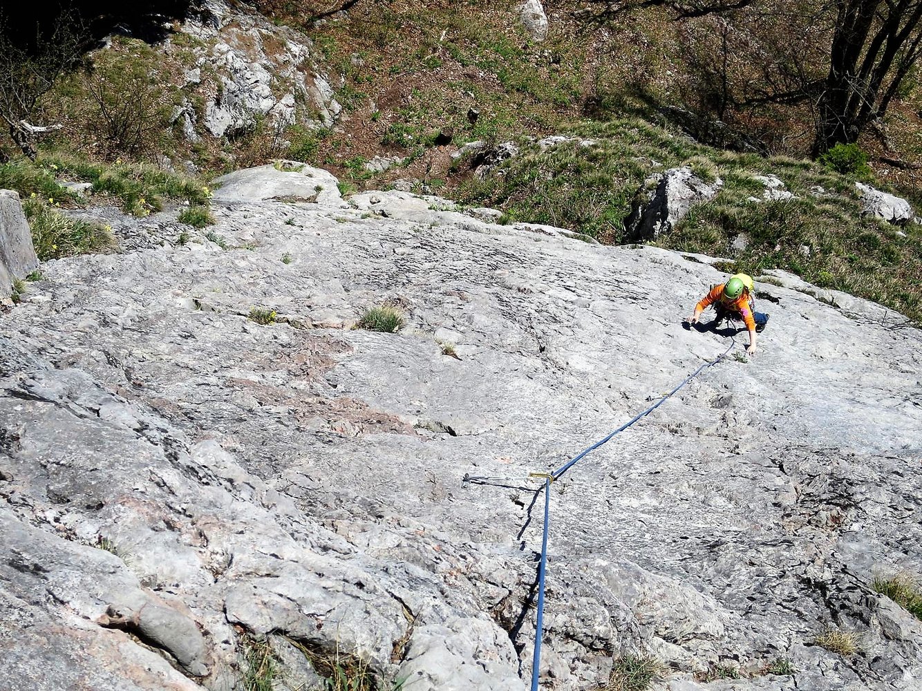 Gut mit Bohrhaken und Sanduhren gesichert, aber doch stellenweise etwas weiter. Die Schlüsselstelle ist aber sehr gut gesichert.
