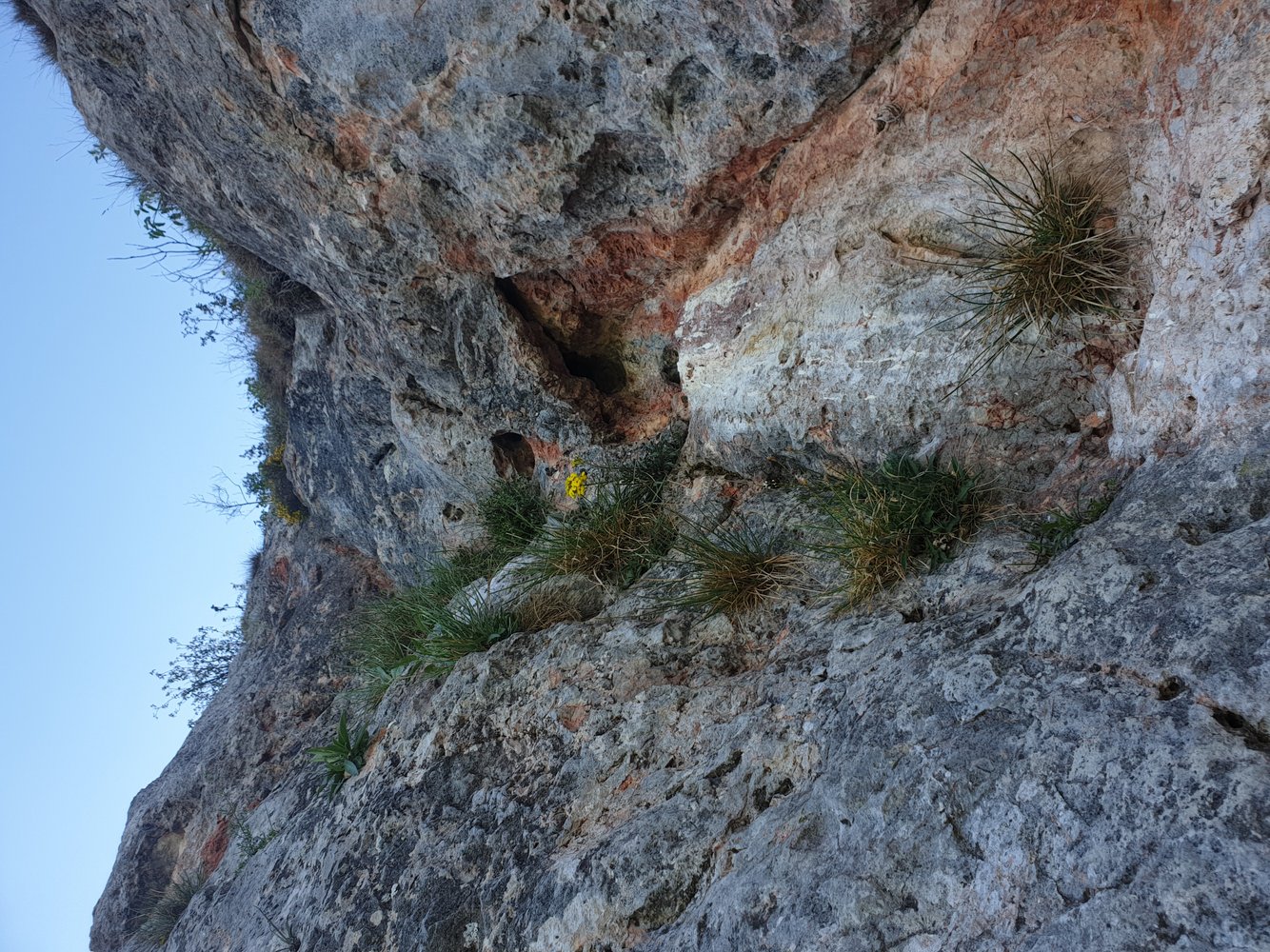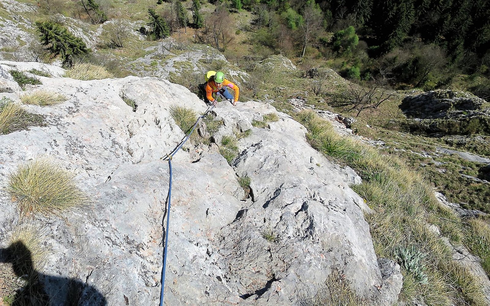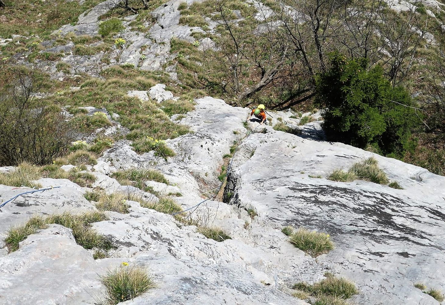 Gut mit Bohrhaken und Sanduhren gesichert, aber doch stellenweise etwas weiter. Die Schlüsselstelle ist aber sehr gut gesichert.