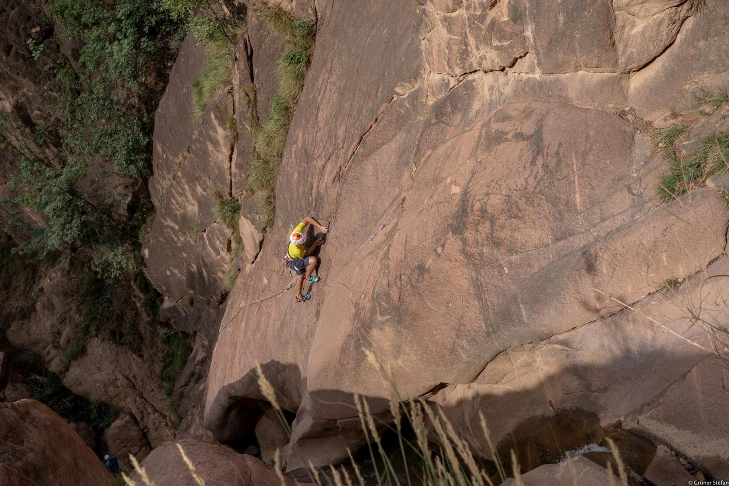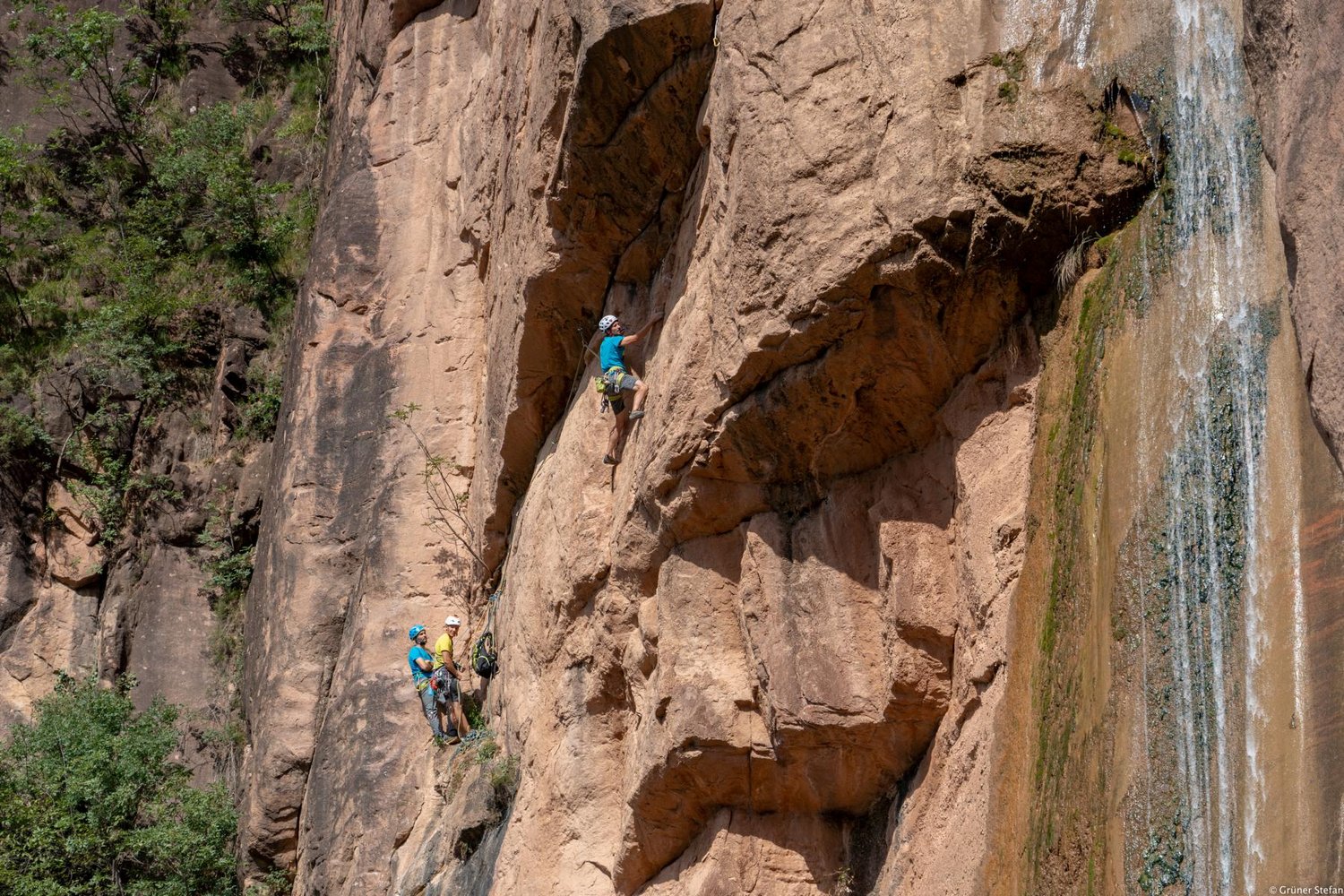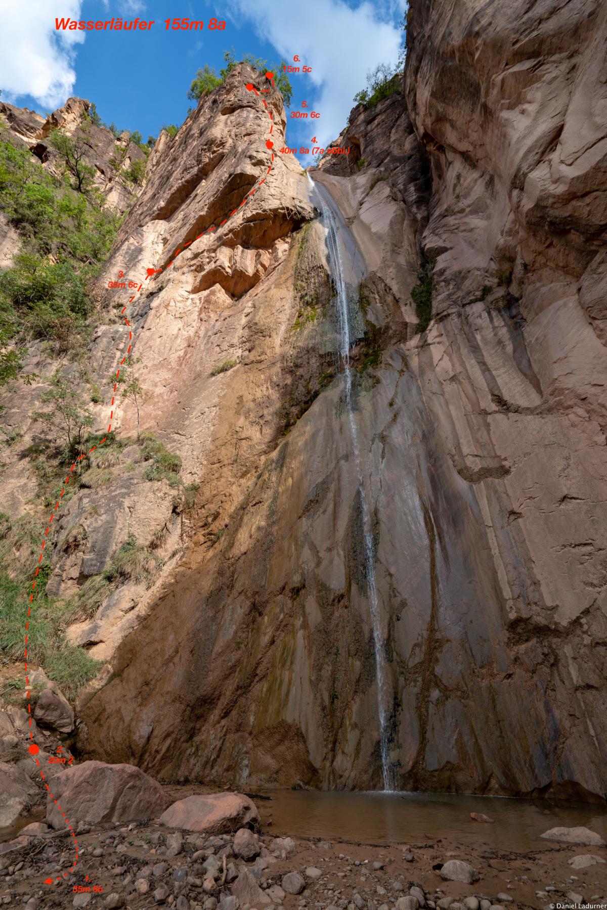 Nachdem Daniel mit Christian Auer schon im Sommer 2017 den Zustieg und die Wand nach möglichen Linien inspizierte und Martin Riegler die Wand im Frühjahr unter die Lupe nahm starteten wir 3 diesen Sommer in mehreren Anläufen um die Route einzurichten. Es kostete einiges an Zeit, Mühe und Kraft die Seillängen in dem nicht immer guten Fels von unten einzubohren und zu säubern. Schlussendlich gelang uns aber eine schöne Route in tollem Ambiente, man klettert oft nur wenige Meter neben dem Wasserfall, die man aber keinesfalls unterschätzen sollte. Wir würden uns auf einige Wiederholer freuen, dadurch würde sie auch noch ein wenig gesäubert. Die Schlüsselstelle kann mit einigen mittleren Friends besser abgesichert oder technisch überwunden werden. Der Zustieg ist relativ kurz, liegt zentral im Etschtal, ist eine der wenigen Routen in der Gegend und kann fast im ganzen Jahr über geklettert werden.