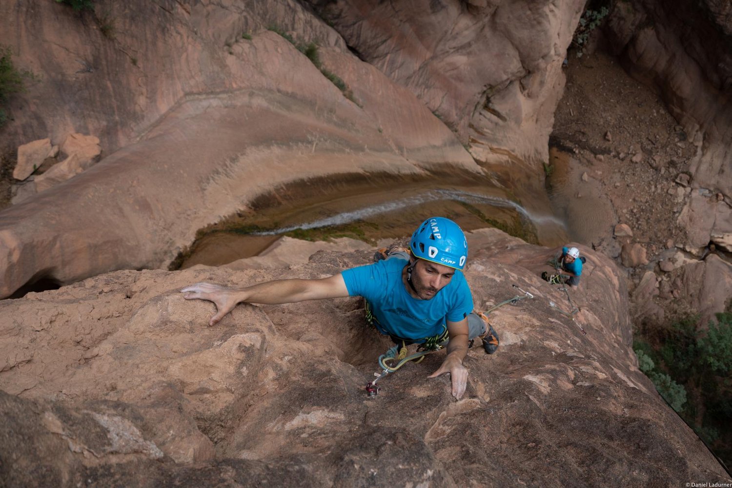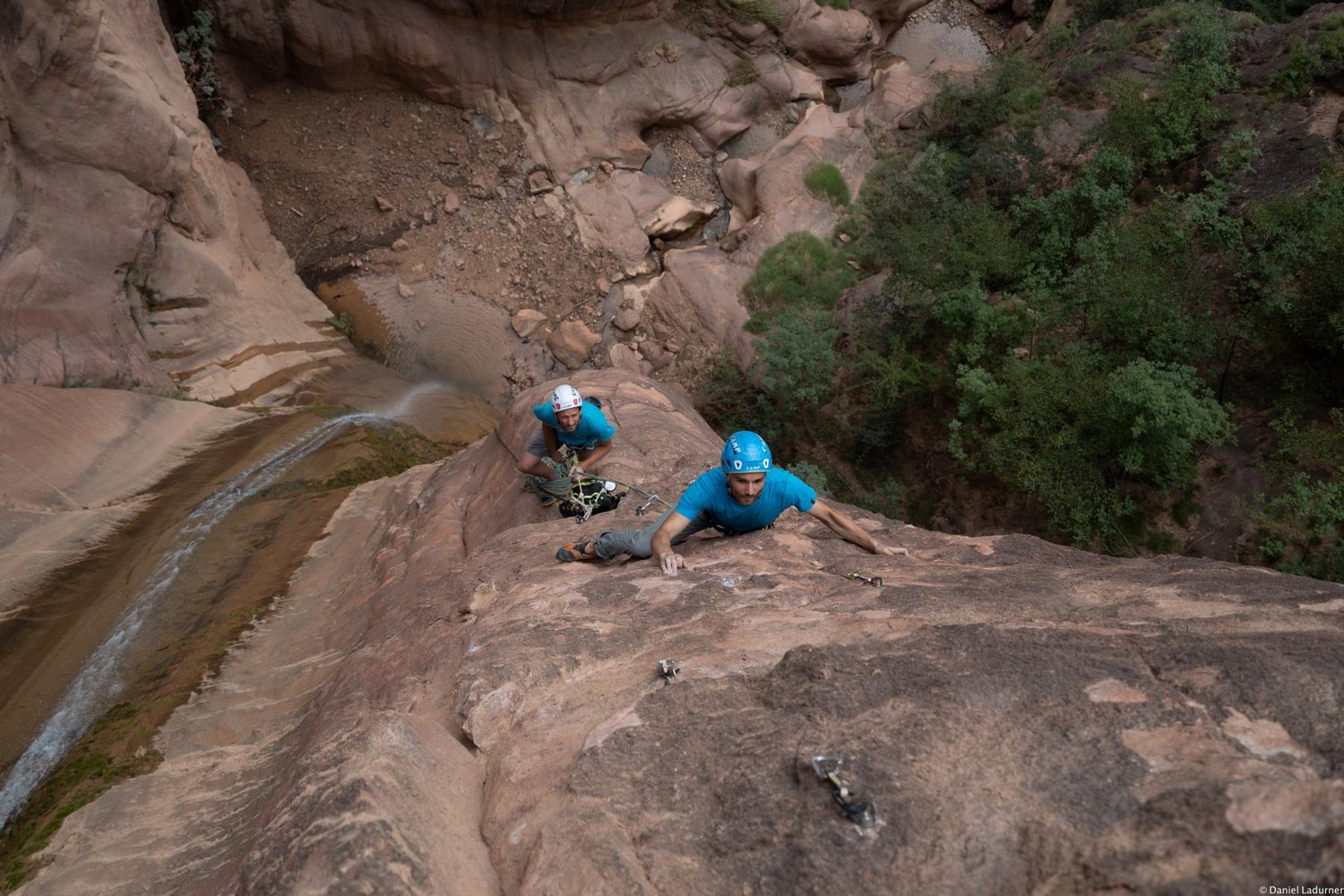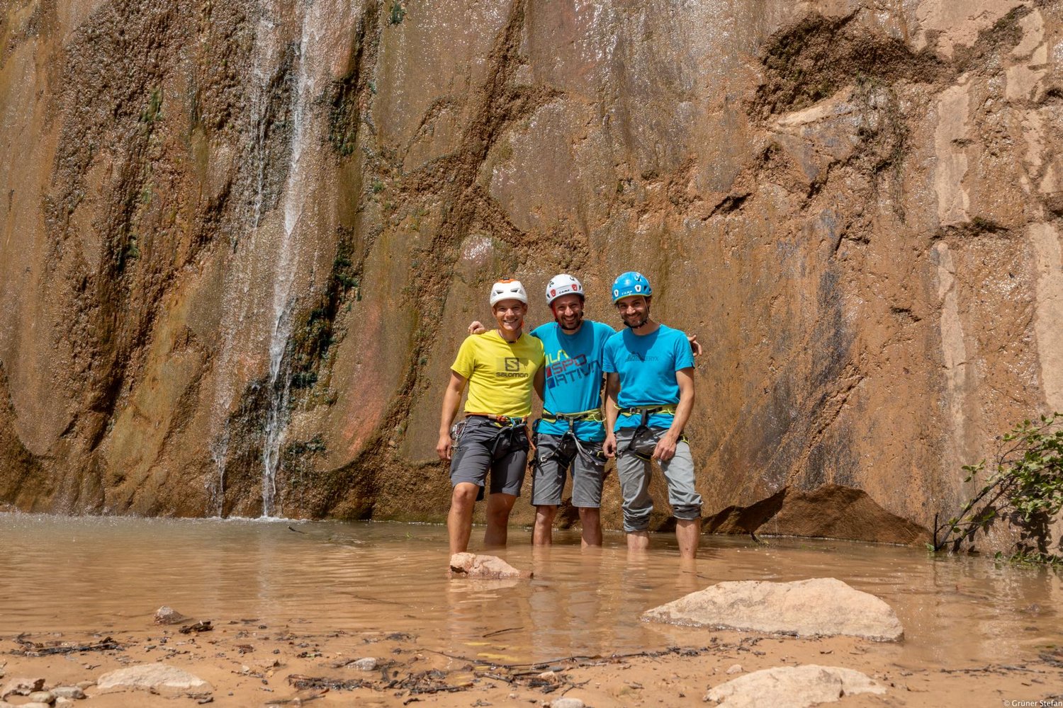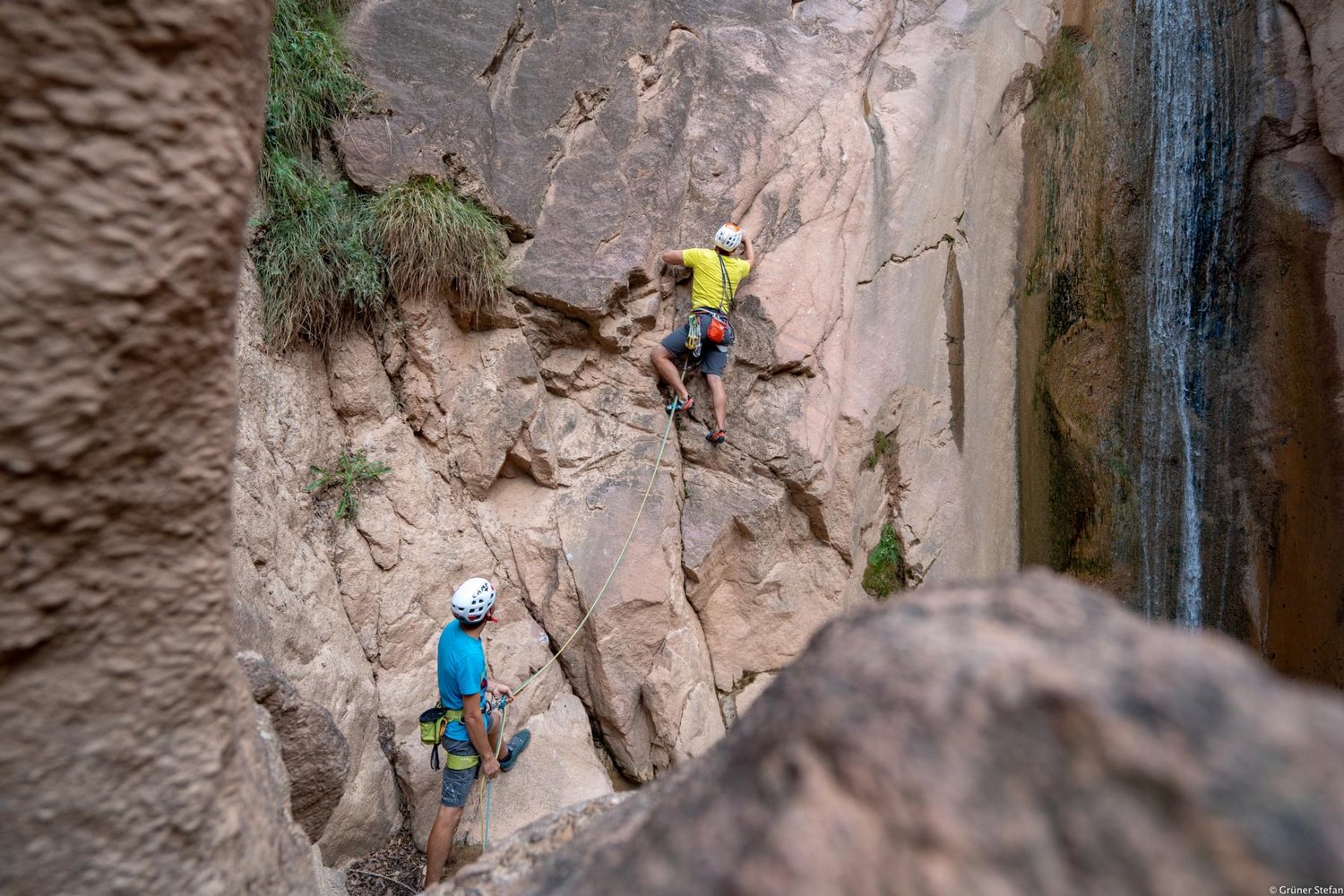 Im oberen Teil über die Route abseilen. Die letzte Seillänge auf der Orographisch linken Seite (Eingerichtete Abseilstelle) Abseilen