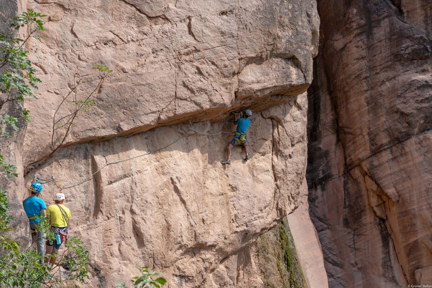 4.Sl 40m 8a Schlüsselstelle kurz nach dem Quergang (Boulder) Rest 7a