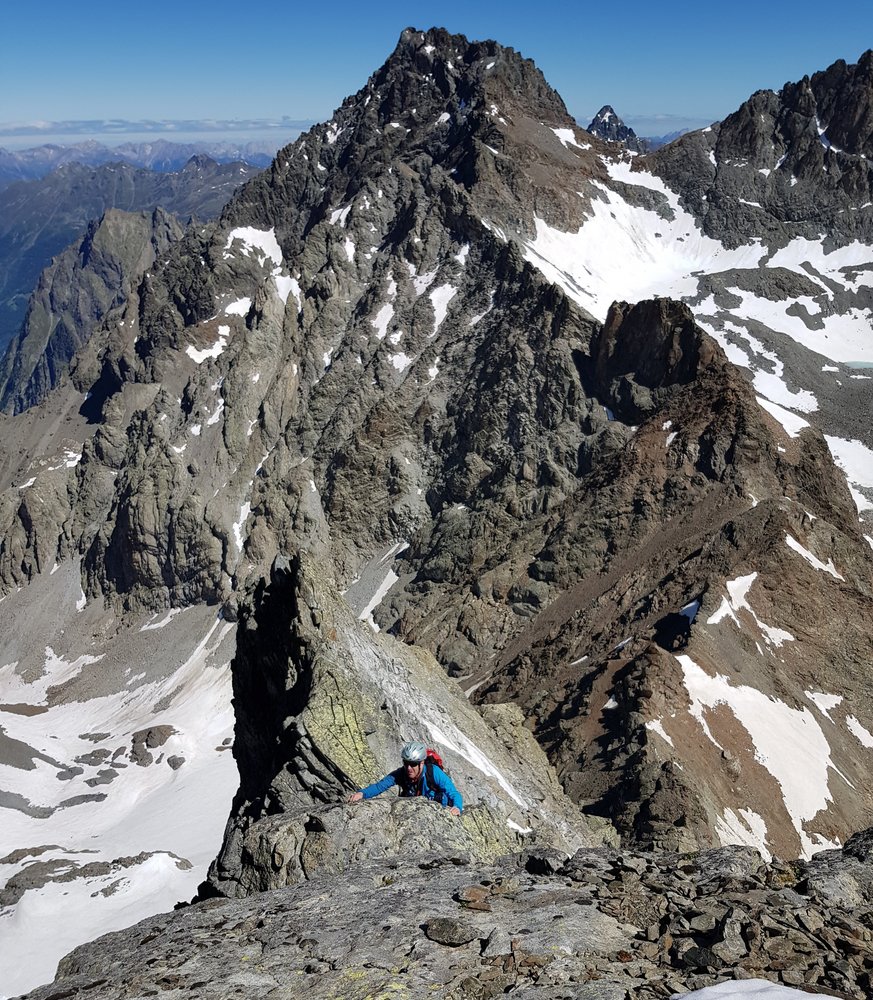 Nach wenigen Klettermetern ca. 3460müM, setzt man auf den Westgrat der Waze auf. Von hier an geht es mehr oder weniger dem Grat nach auf den Gipfel. (teilweises Umgehen der Türme möglich).