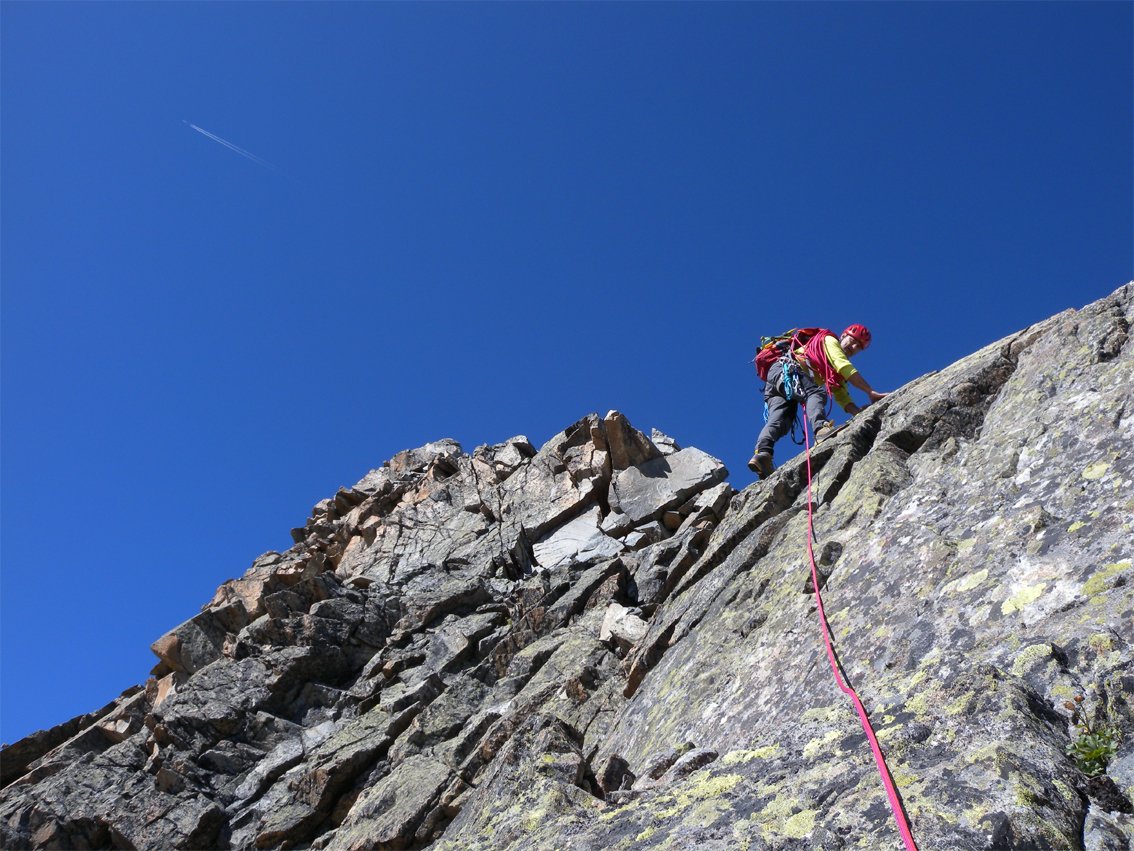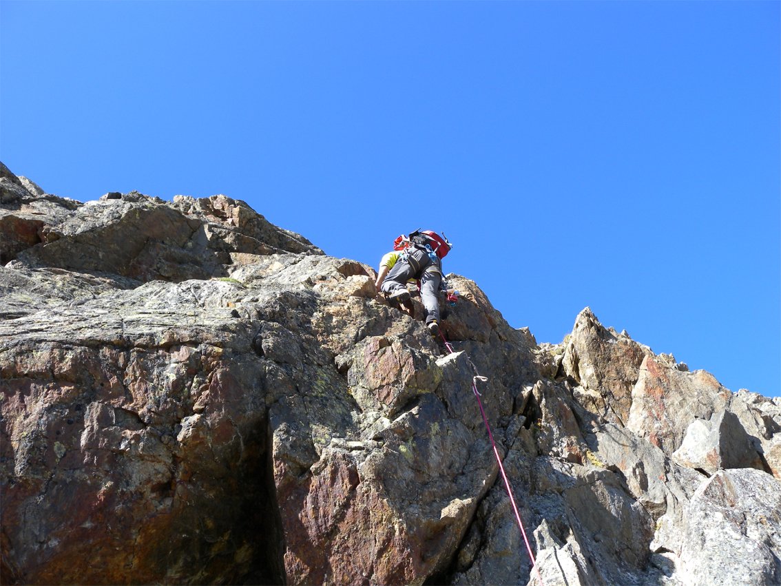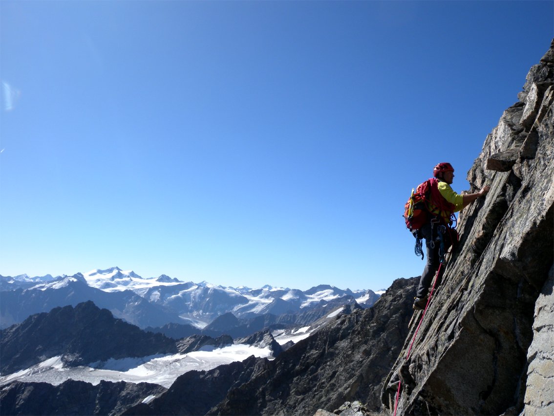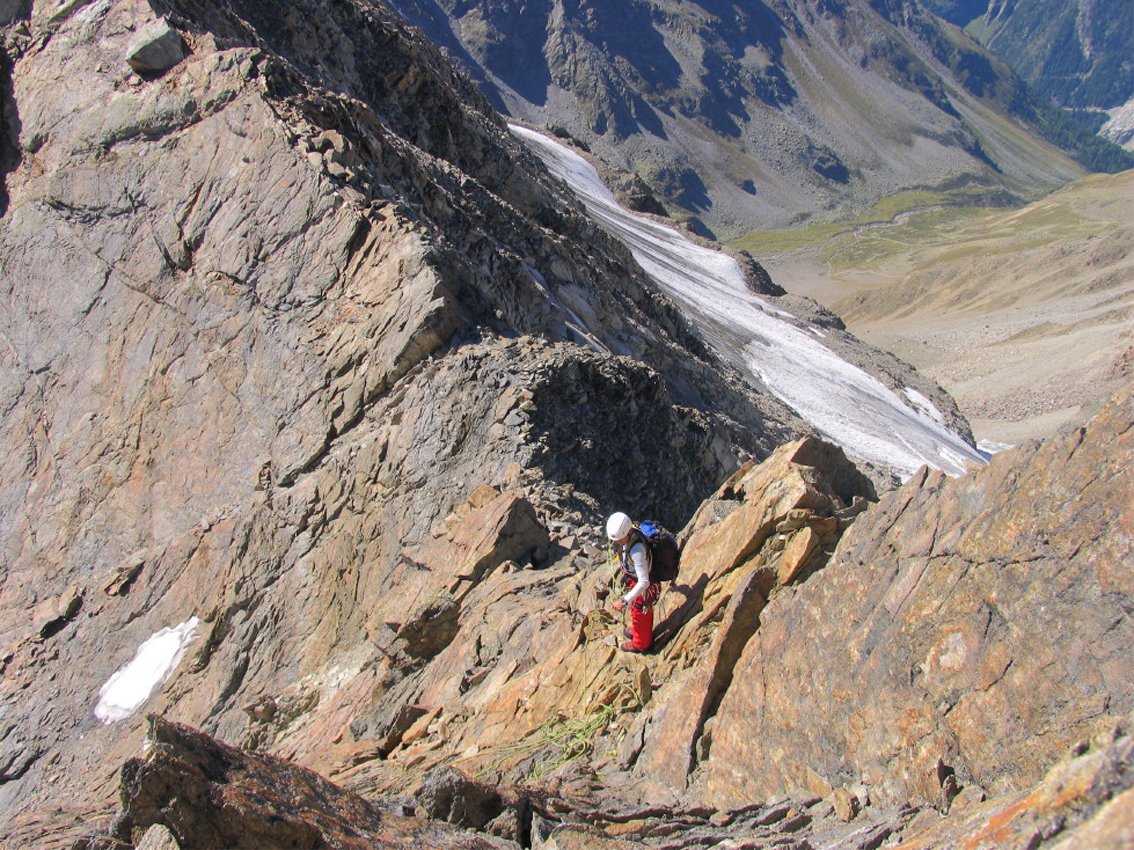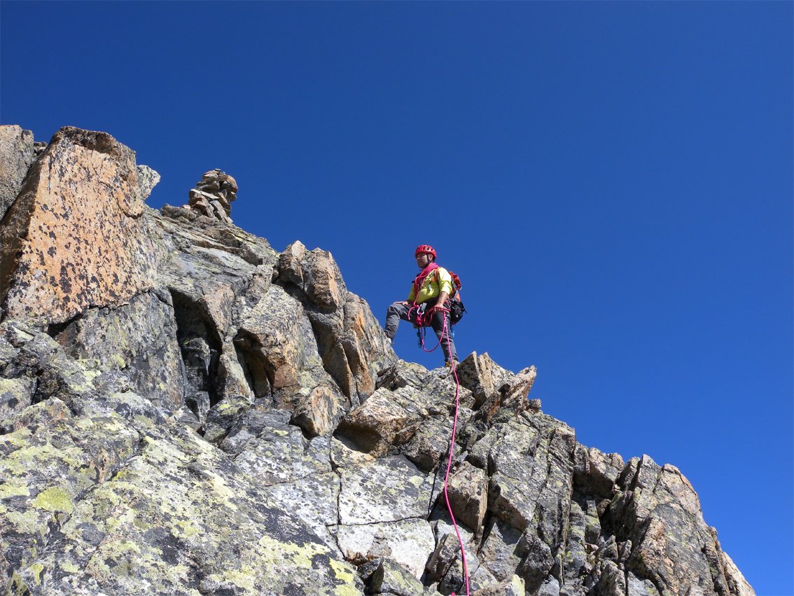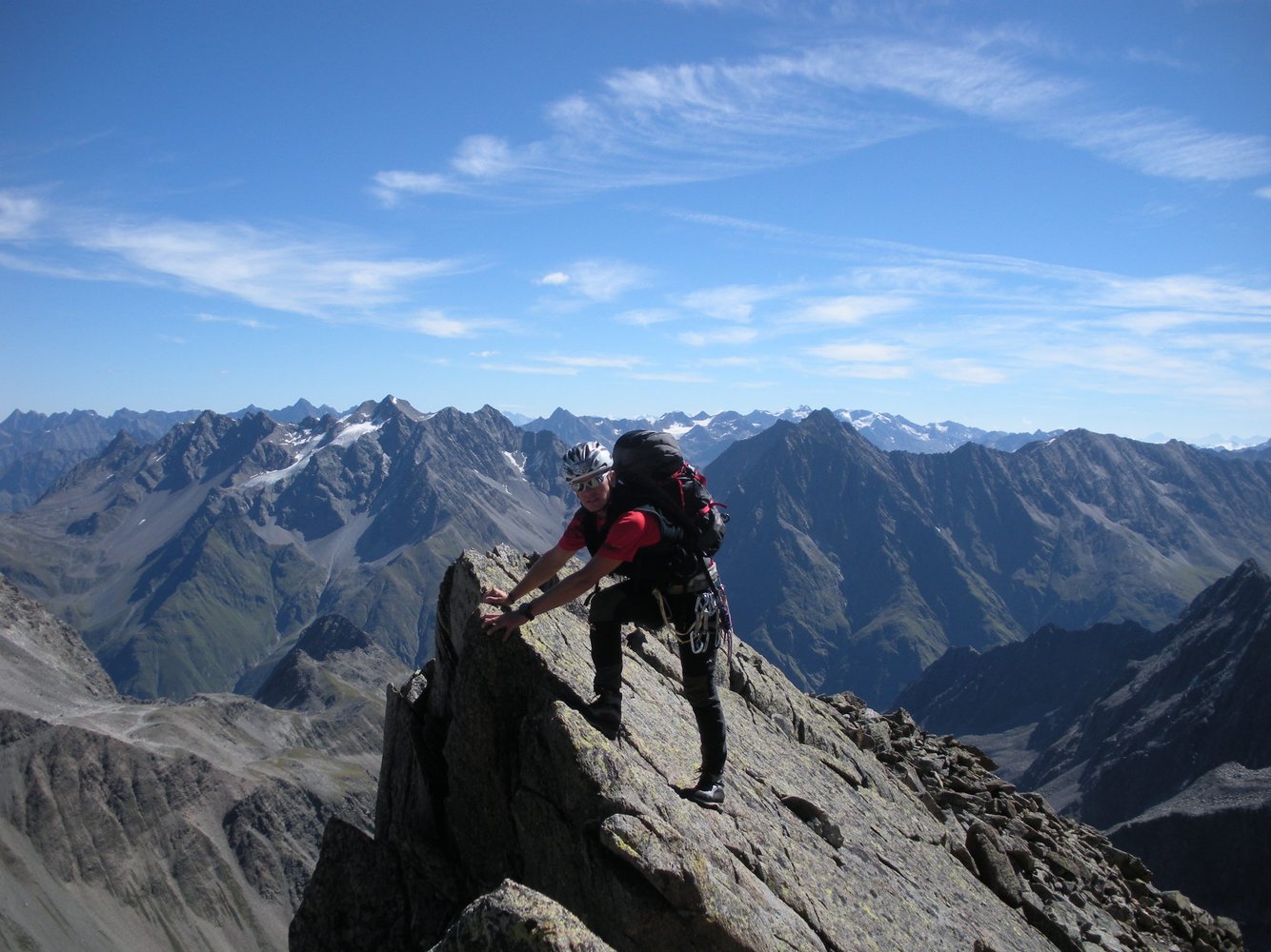 Klassische und fantastische Gratkletterei! Der Anstieg ist dank des bohrhakengesicherten dir. Einstieges immer beliebter. Die Kletterei in meist gutem Granit ist nie richtig schwer, einzig eine kurze Wandstelle und der Einstiegspfeiler weisen kurz den 4ten Grad auf. Im oberen Teil anregende Gratkletterei bis zum Gipfel, der ein tolles Panorama zu den Ötztaler Eisriesen bietet.