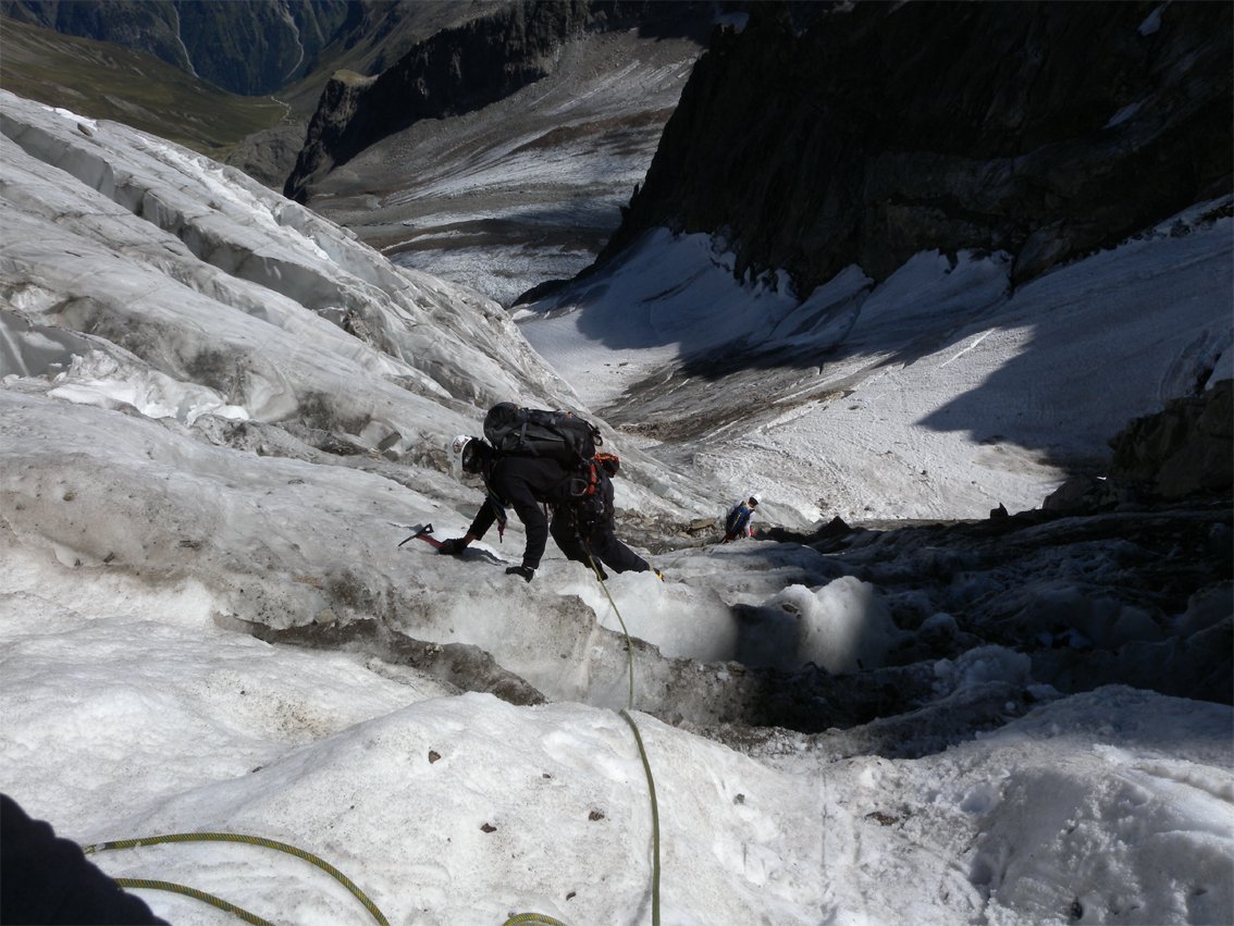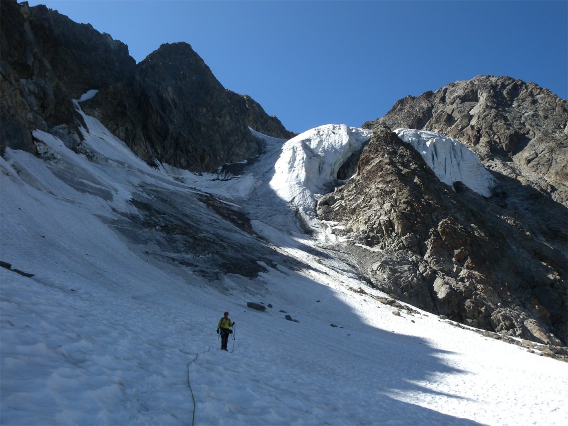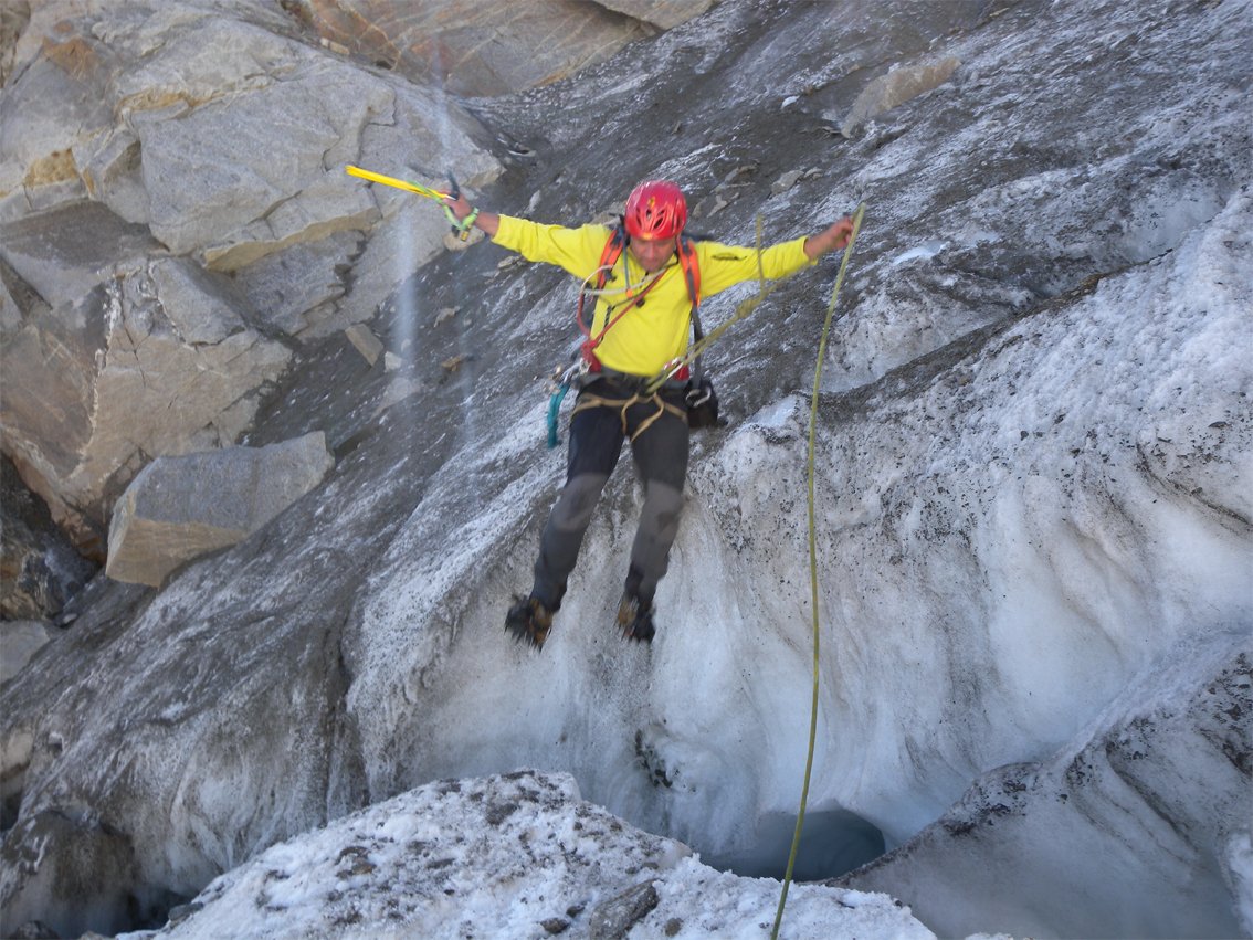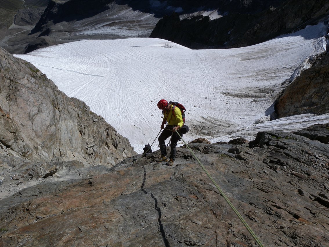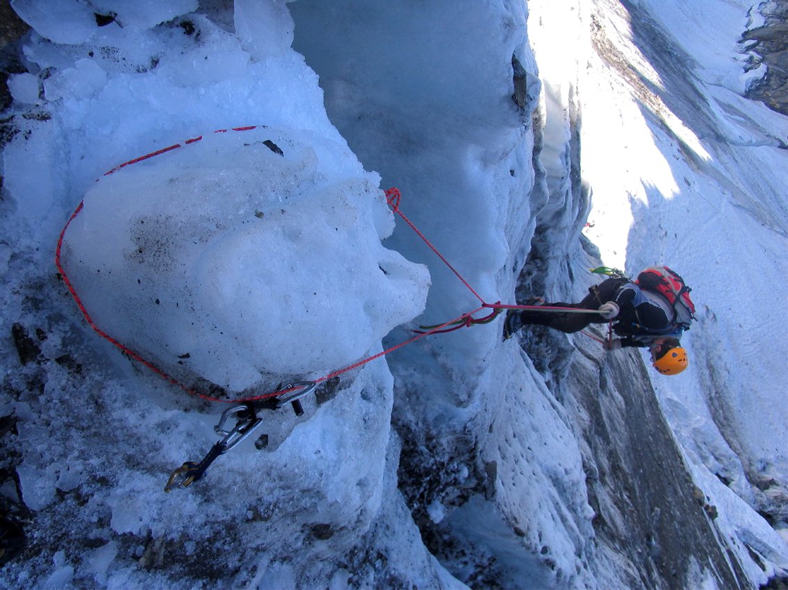 60 m Einfachseil, 5 Express, evtl. KK-Grundsort. Bei Abstieg über den Eisweg komplette Gletscherausrüstung. Beim Abseilen am Eisweg ist ein Doppelseil von Vorteil (es geht dann schneller).