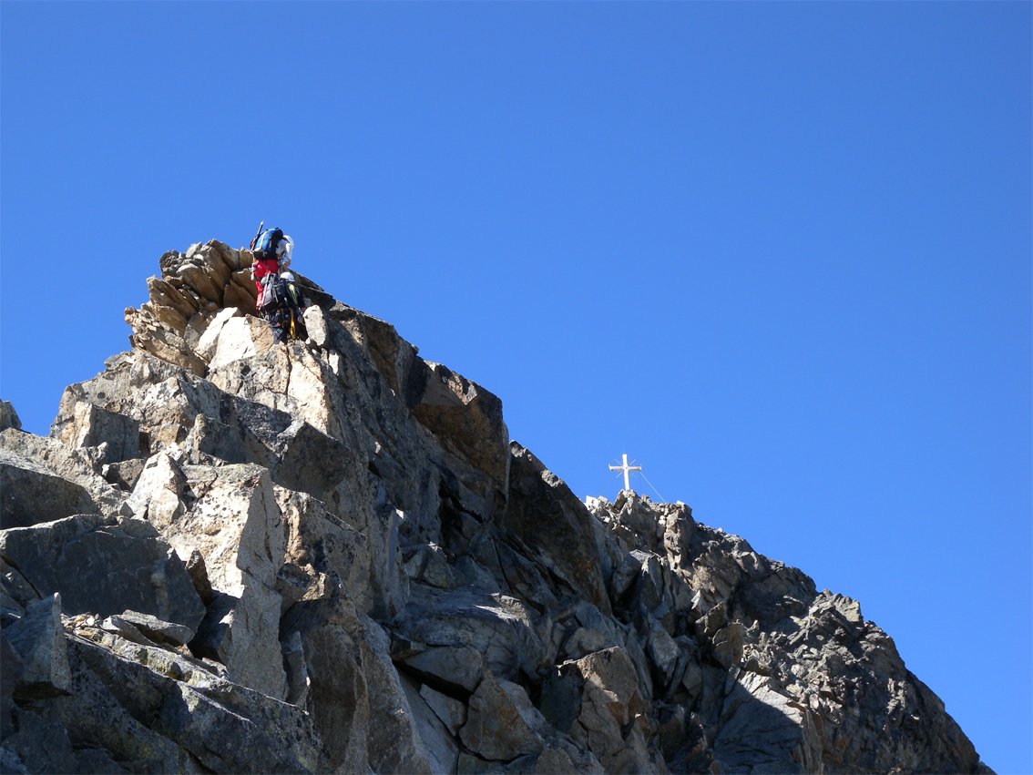 Achtung: Wer keine sehr solide Eiserfahrung hat, sollte wieder über den Ostgrat absteigen. Der Abstieg auf dem sog. Eisweg - also zuerst über den Südgrat und dann der Weiterweg auf dem Plangeross-Ferner - ist wegen zunehmender Ausaperung des Gletschers sehr heikel und gefährlich! Es hat schon Leute gegeben, die an die 8 Stunden für den Abstieg über den Eisweg gebraucht haben.
