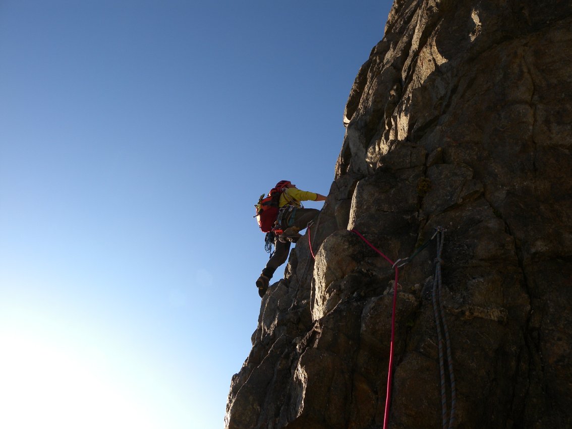 Der Grat ist an den schweren Stellen mit Bohrhaken gesichert, tlw. sind auch rote Markierungen angebracht (die Markierung findet man aber nicht immer...)