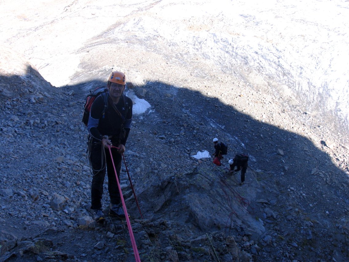 Am besten mit dem Hüttenwirt am Vorabend die Verhältnisse abklären. In der Regel wird auf dem Ostgrat (also über den Aufstiegsweg) wieder abgestiegen und über schwere Stellen abseilen (am sichersten). Die leichten Seillängen klettert man ab, die schwereren Stufen seilt man ab, siehe Toposkizze (das Topo wurde 2023 ergänzt).