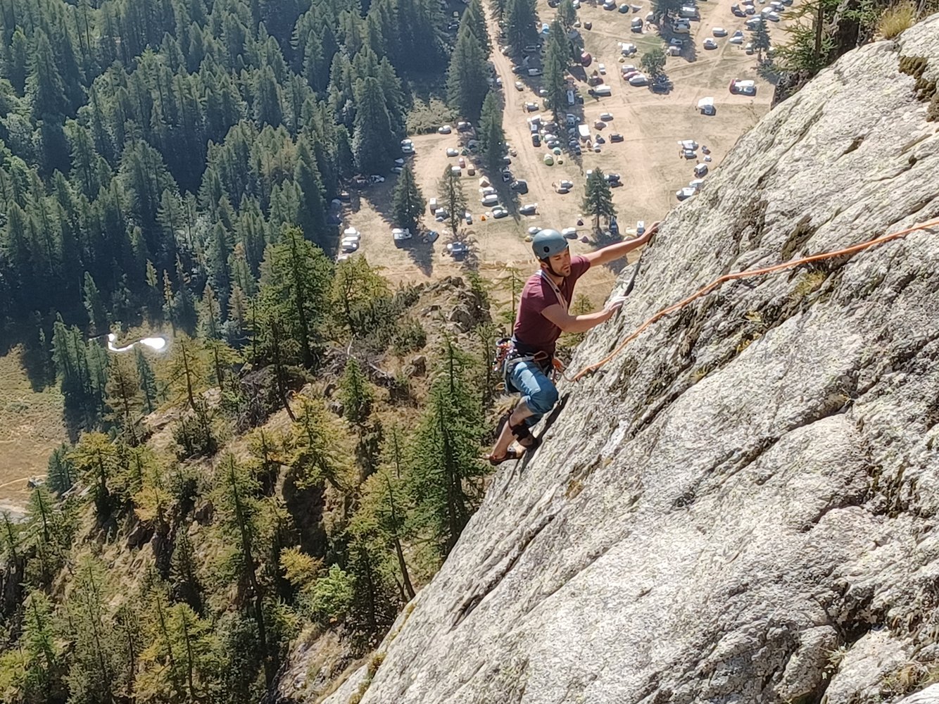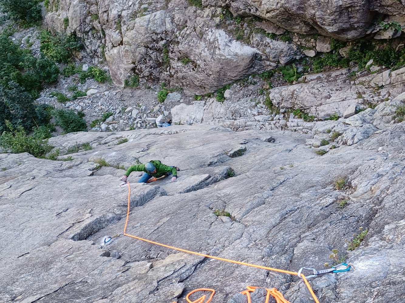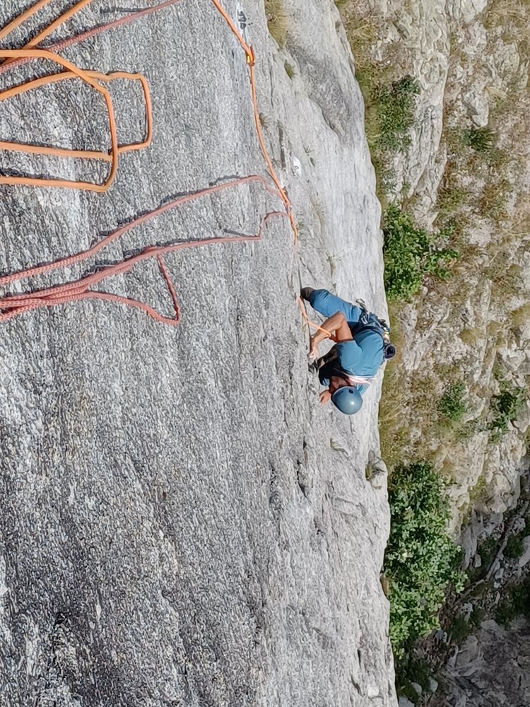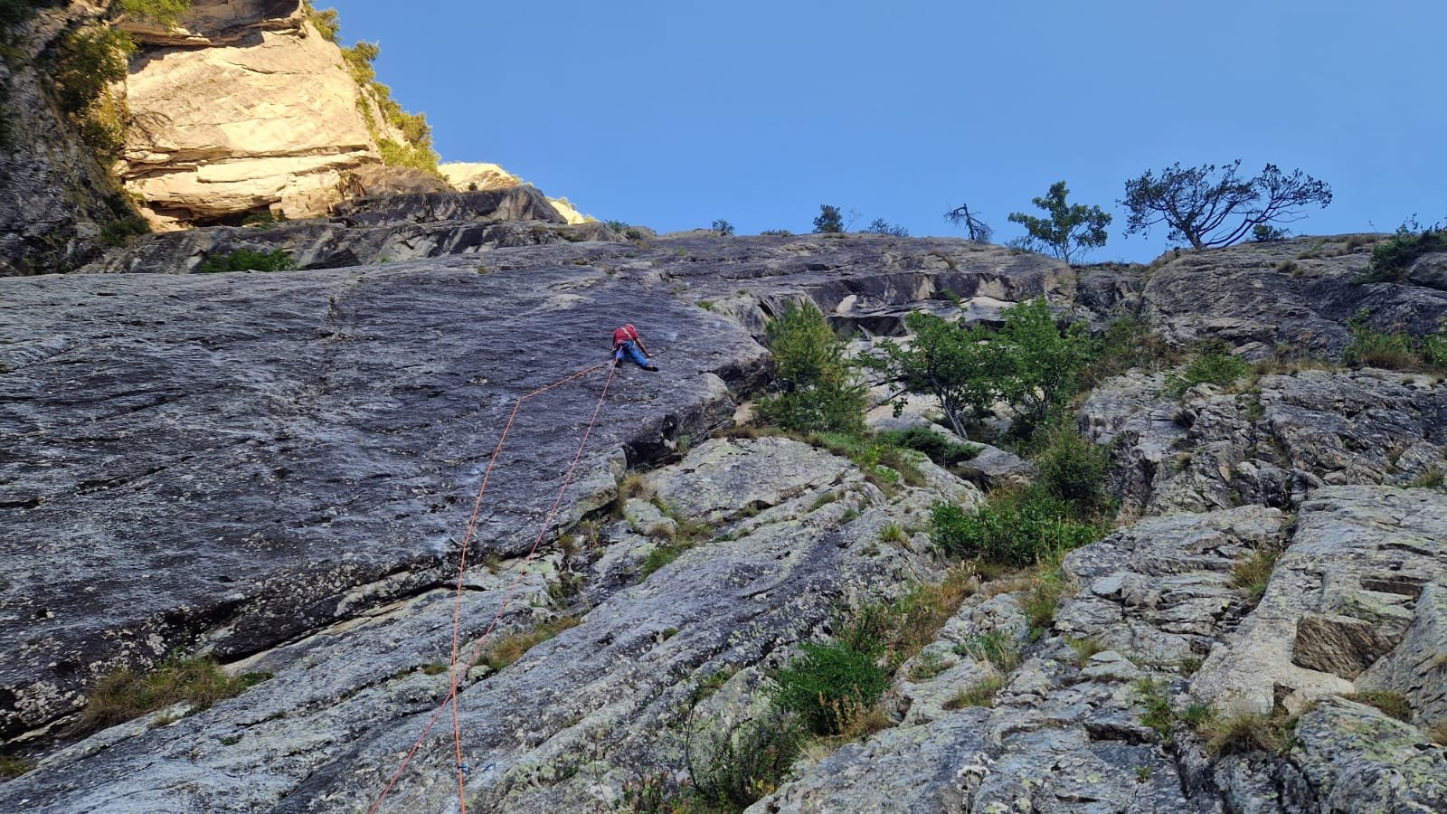 Bombenfester Granit, kurzer Zustieg, landschaftlich super (Ailefroide ist einfach cool) und durchgehend mit Bohrhaken abgesichert: gibt es auch einen Haken? Nein, zumindest dann wenn man Plattenkletterei mag. Wobei die Tour auch zwischendurch andere Features wie Verschneidungen aufweist. Die Tour ist gut abgesichert - aber im Vergleich zu den populären Plaisirrouten im Tal muss man schon ein wenig weiter weg vom Haken klettern. Will heißen: die 6c-Stellen sind obligat zu klettern (der letzte Bohrhaken bei oder knapp unterhalb der Füße). Die Variante in der 5. Seillänge konnte nicht befreit werden, ist aber eh nicht so schön wie die später entdeckte jetzige Länge. Wenn wer Lust hat: wir haben die Bolts belassen.