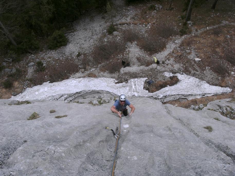 Besser mit Helm klettern, es liegen lose Steine auf den Bändern. Nach starken Regenfällen besser einen trocken Tag abwarten, sonst wird es bei den Graspassagen unangenehm