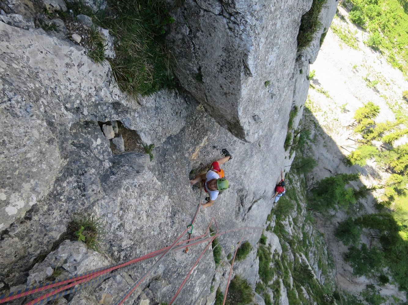 Einfachseil, 12 Expreßschlingen, Helm und lange Bandschlingen.