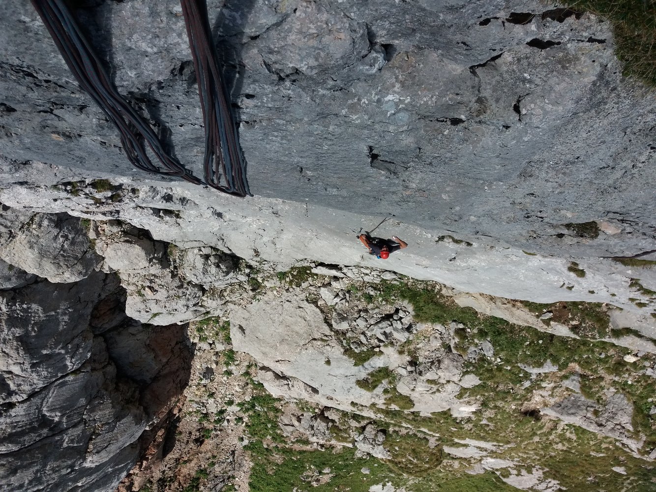 1. Empfohlen: Über die Wand abseilen (1 x ca. 60m), problemlos zum 1. Stand.