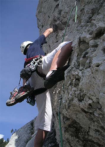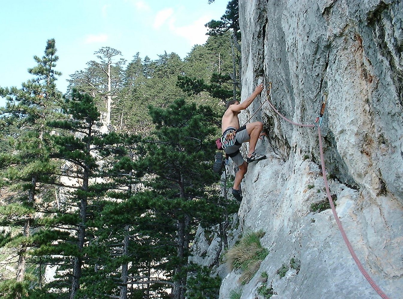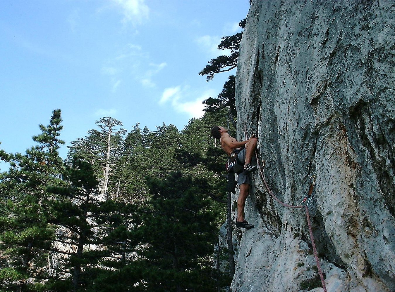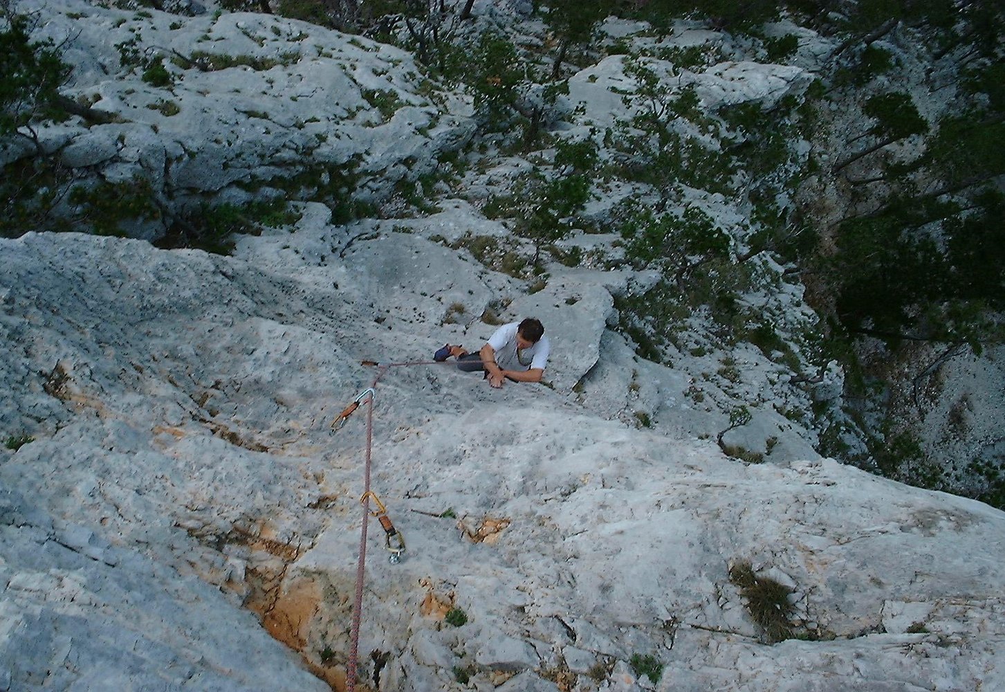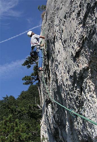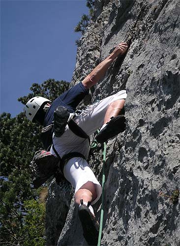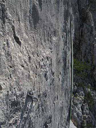 Ganz gute Wandstellen, die gegen oben hin immer besser werden, aber auch Blockgelände ist vorhanden. Die Tour ist gut abgesichert, bei Zuhilfenahme der Haken reduziert sich die Schwierigkeit auf 6+