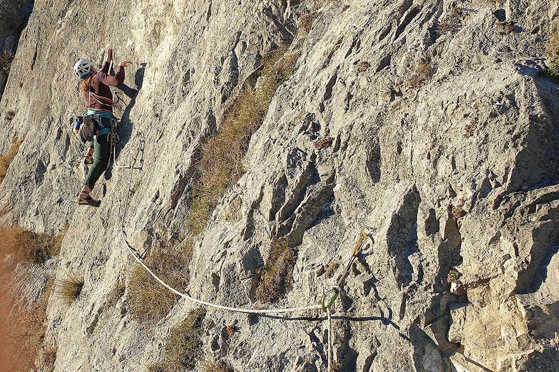 5 SL.: Schöne Quergang nach links, dann steil und plattig aufwärts, dann bei anhaltenden Schwierigkeiten (erdig) gerade nach oben.