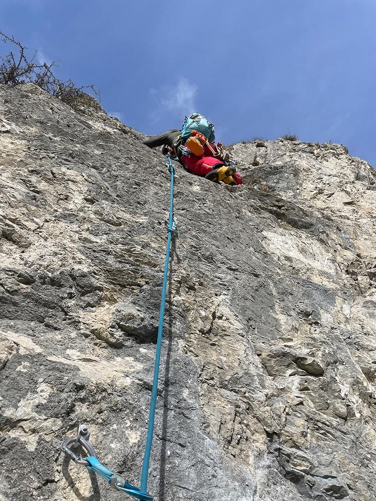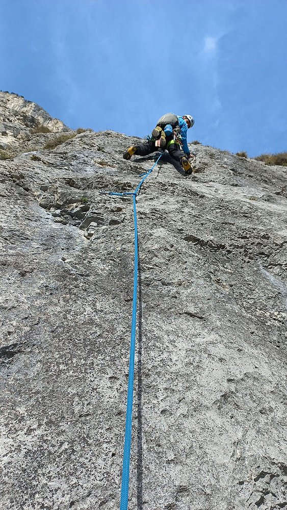 Die Route ist relativ gut mit Haken gesichert (Stände jeweils 2 Bohrhaken) - in den leichteren Seillängen teilweise weitere Hakenabstände.