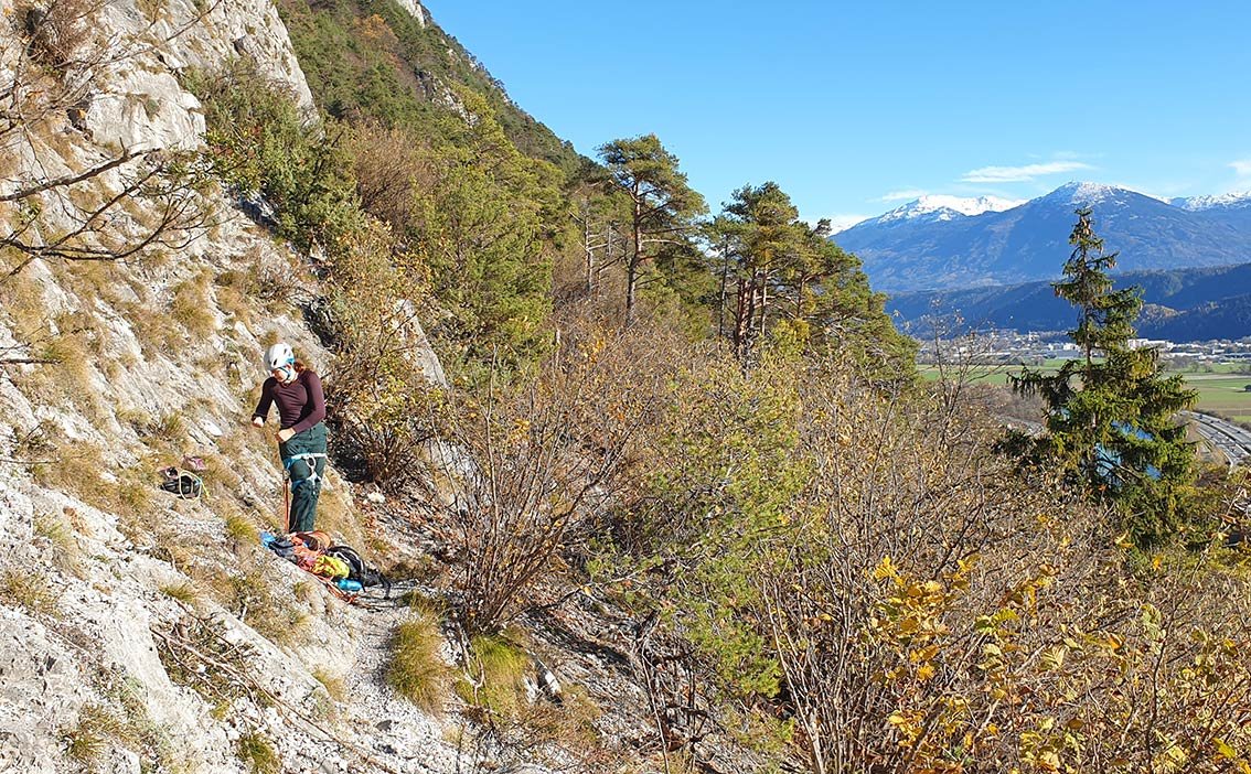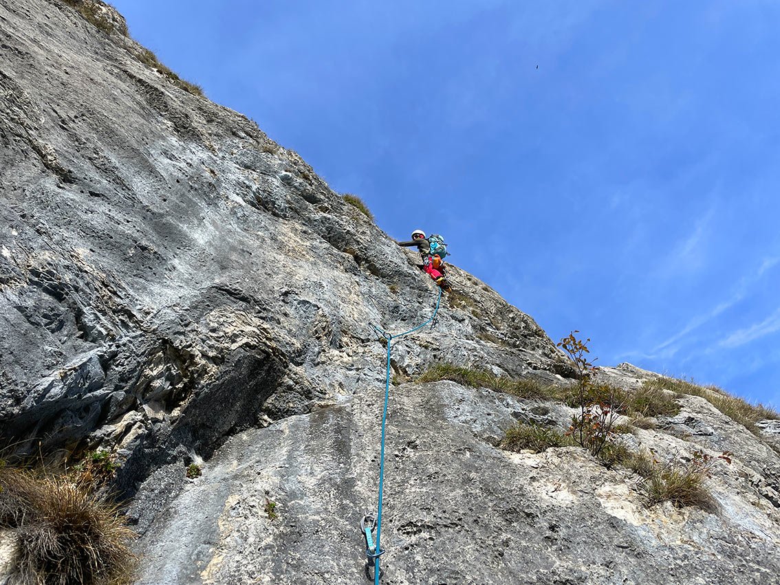 4 SL.: Längste Seillänge plattiger, steiler Start, dann aber etwas erdige Schrofen-Kletterei im Mittelteil – Stand auf markanten Pfeilerkopf (rechts sieht man den Standplatz der Kaiser Max Spätlese).
