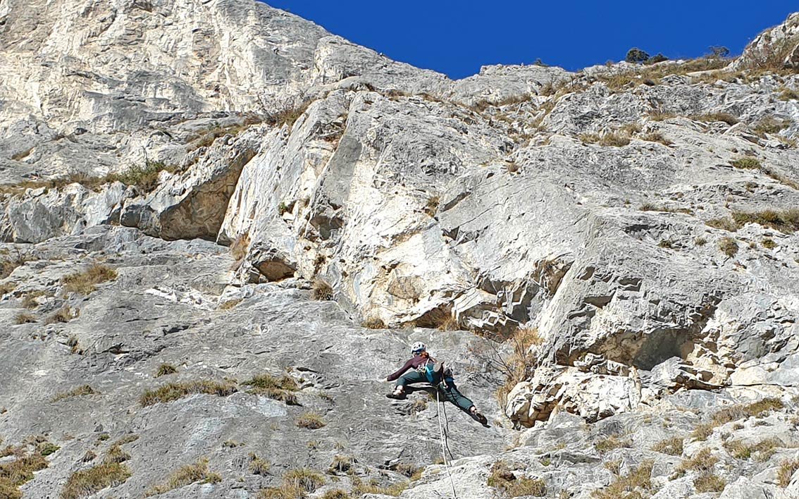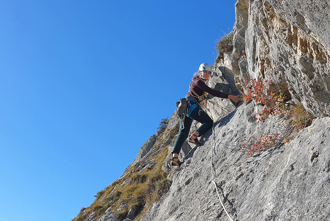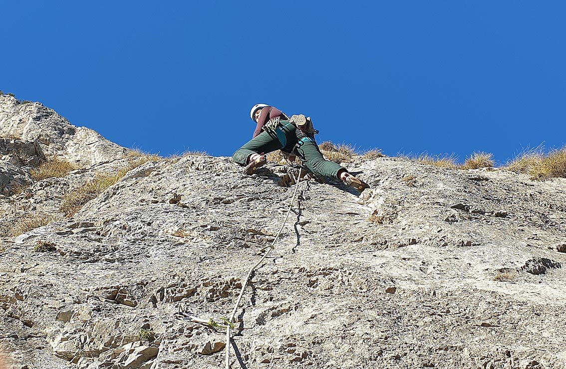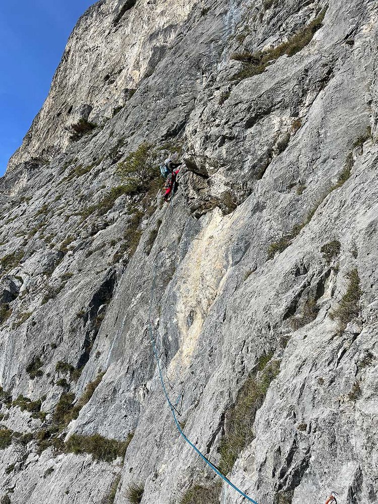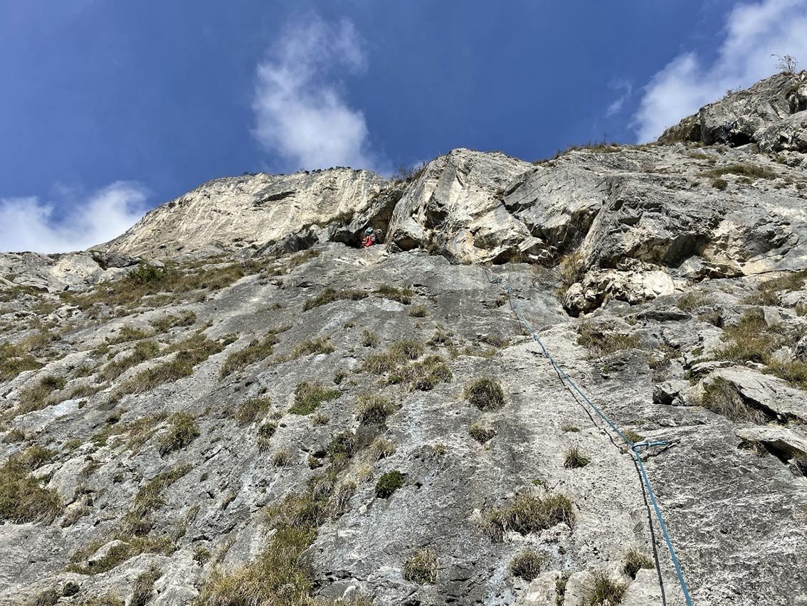 1 SL.: Über Schrofen zum ersten Bohrhaken, dann anfangs plattig unter einem schräg verlaufenden Dach auf schöne Plattenrampe zum Stand.