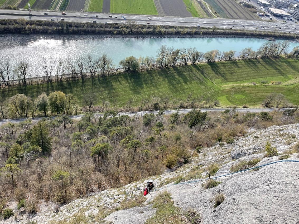 Es gibt auch die Möglichkeit links neben der Rucola-Tour (4 x 50 m abzuseilen - siehe Topo Rucola). Wenn andere unter einem bzw. in der Rucola klettern, sollte man wegen des Steinschlages aber nicht abseilen!