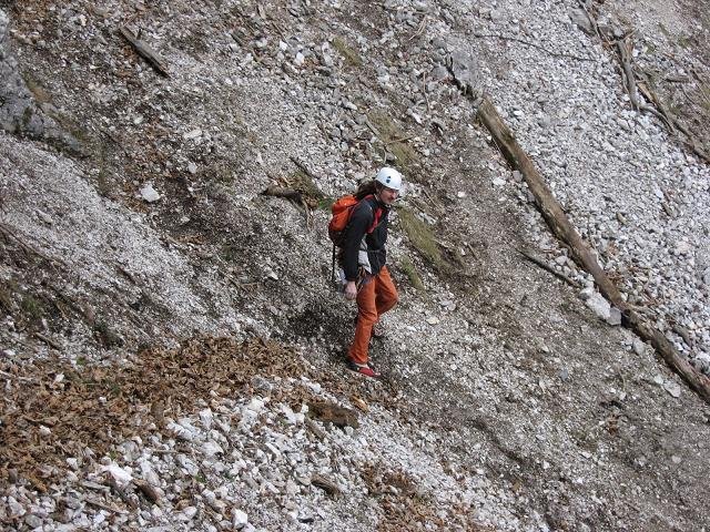 Oben rechts auf Steigspuren zuerst waagrecht zu einem Steinmann auf einem Felsrücken queren, dann etwas links haltend, teils mit Drahtseilen versichert bis in Schutthalde absteigen und über diese zurück.