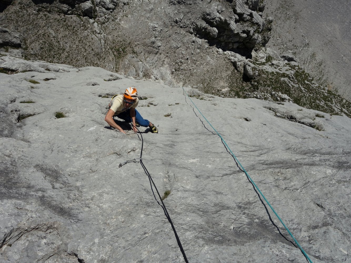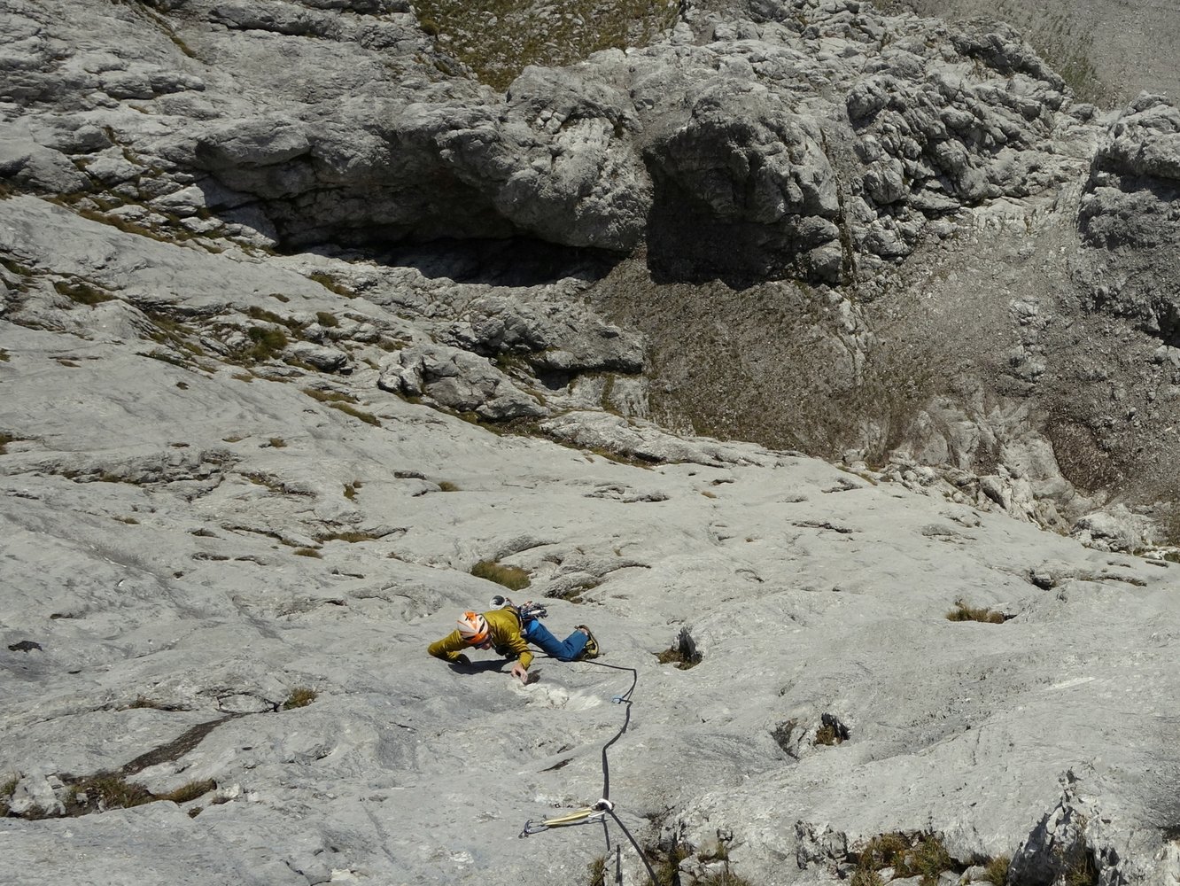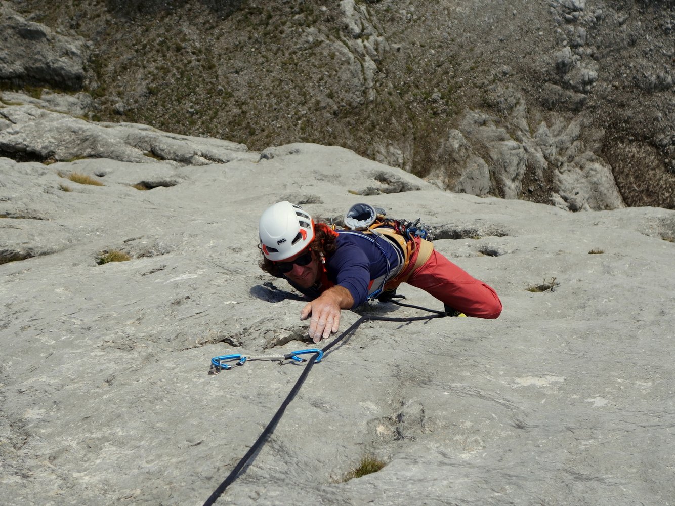 Nach eienm etwas rustikalem Vorbau (1. u. 2. SL) geniale, steile, aber anspruchsvolle alpine Kletterei in super Koasa-Fels!