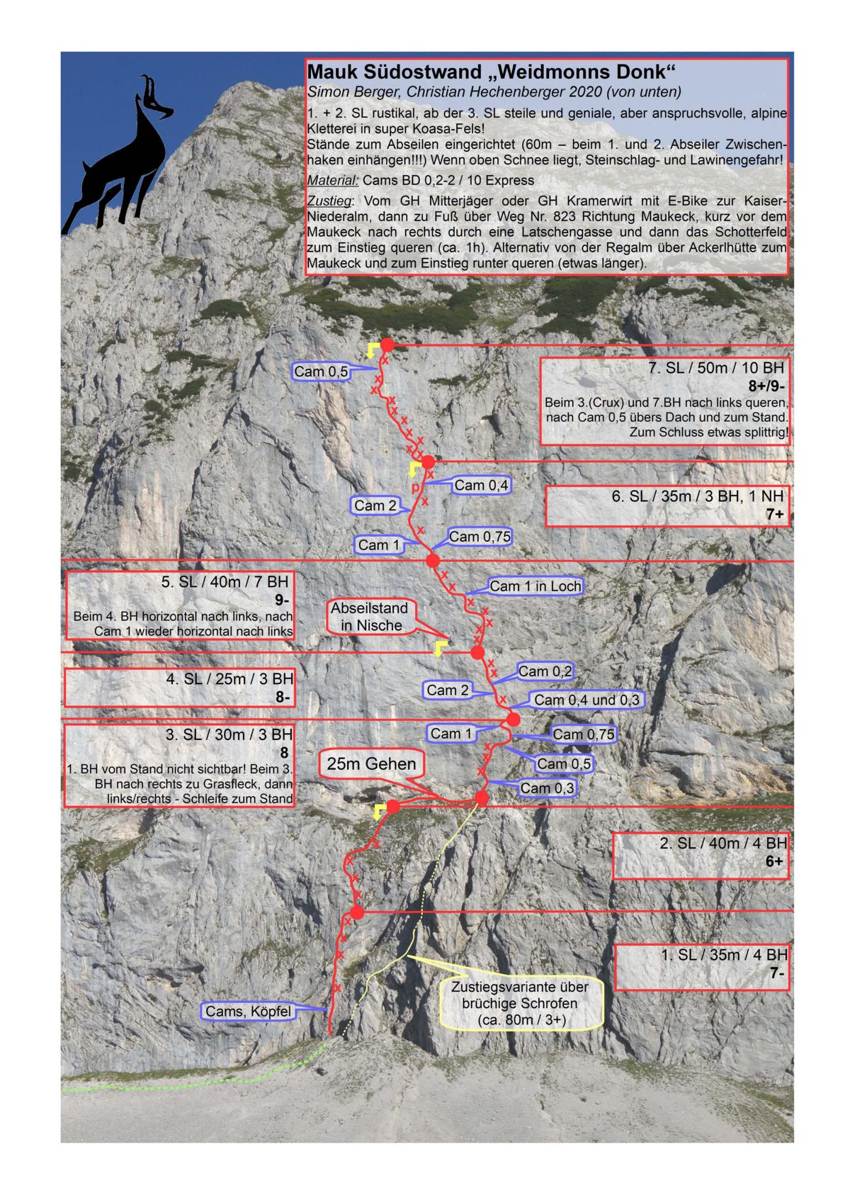 Anmerkung der Erstbegeher: Für die erste Wiederholung gibt’s a paar Gamswürstel, fürs erste Onsight a Paar Gamswürstel und a Bier