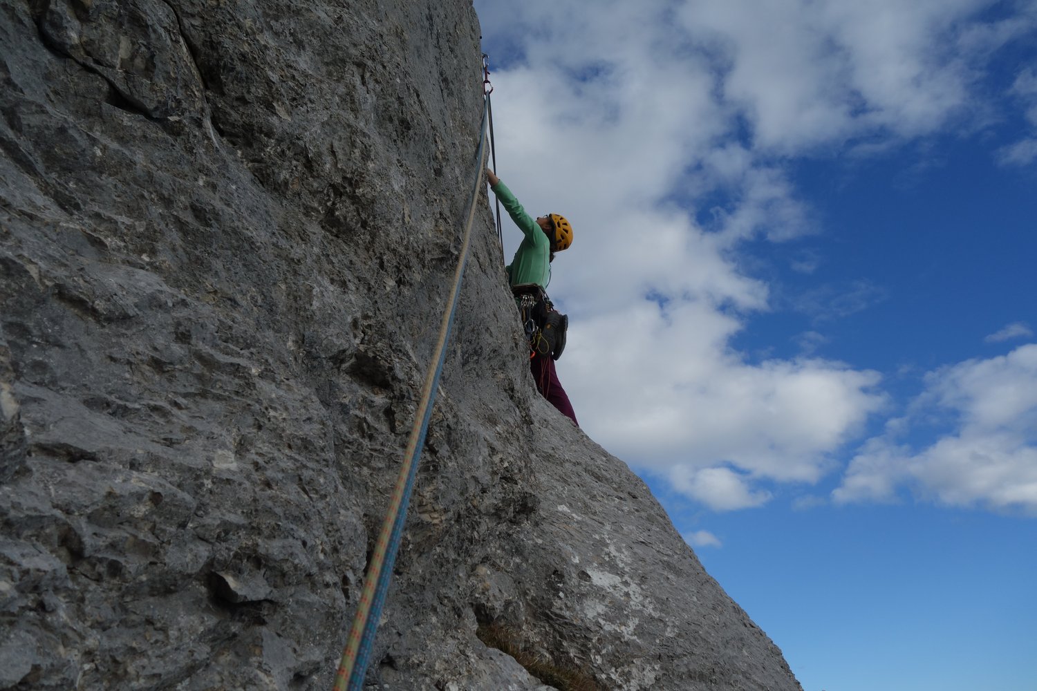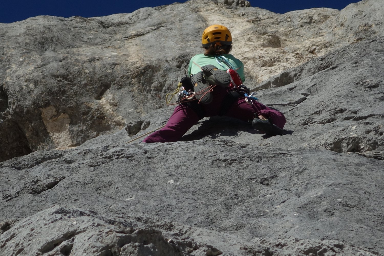 1. SL: Abdrängend von rechts oder direkt über Piazriss auf Band und Gleichgewichtsspiel nach links auf Rampe (6). Diese gerade hinauf bis zu alter SU-Schlinge (mit Friend verbesserbar, 5, 5+) und ausgesetzter Rechtsquergang an senkrechter Wand (6-) zu Piazschuppe und diese gerade hinauf (6-, Friend) zu Stand an 1 BH und 2 NH (35m, 6, 6 BH, 1 SU, Friends)