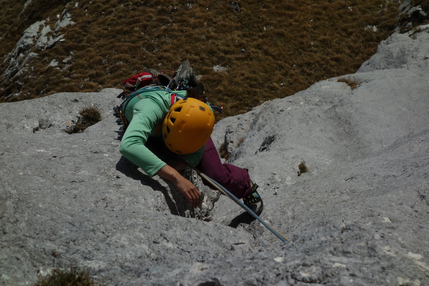 Die Route ist zum abseilen eingerichtet, allerdings befindet sich der letzte Abseilstand 5m südlich des Grats und besteht nur aus einer nicht übermäßig dicken SU mit alter Schlinge; uns war der Fußabstieg deshalb deutlich sympathischer!