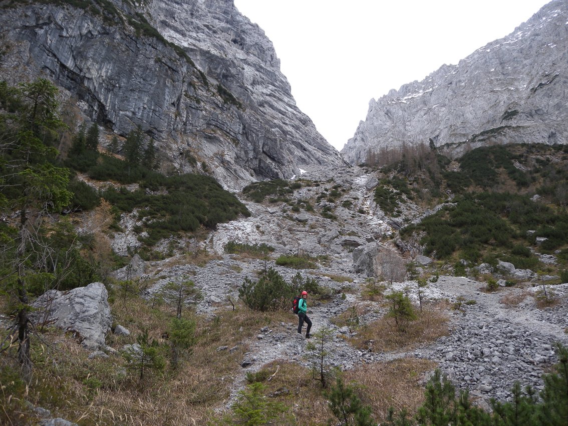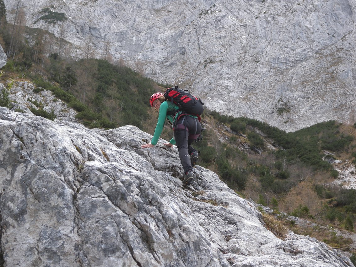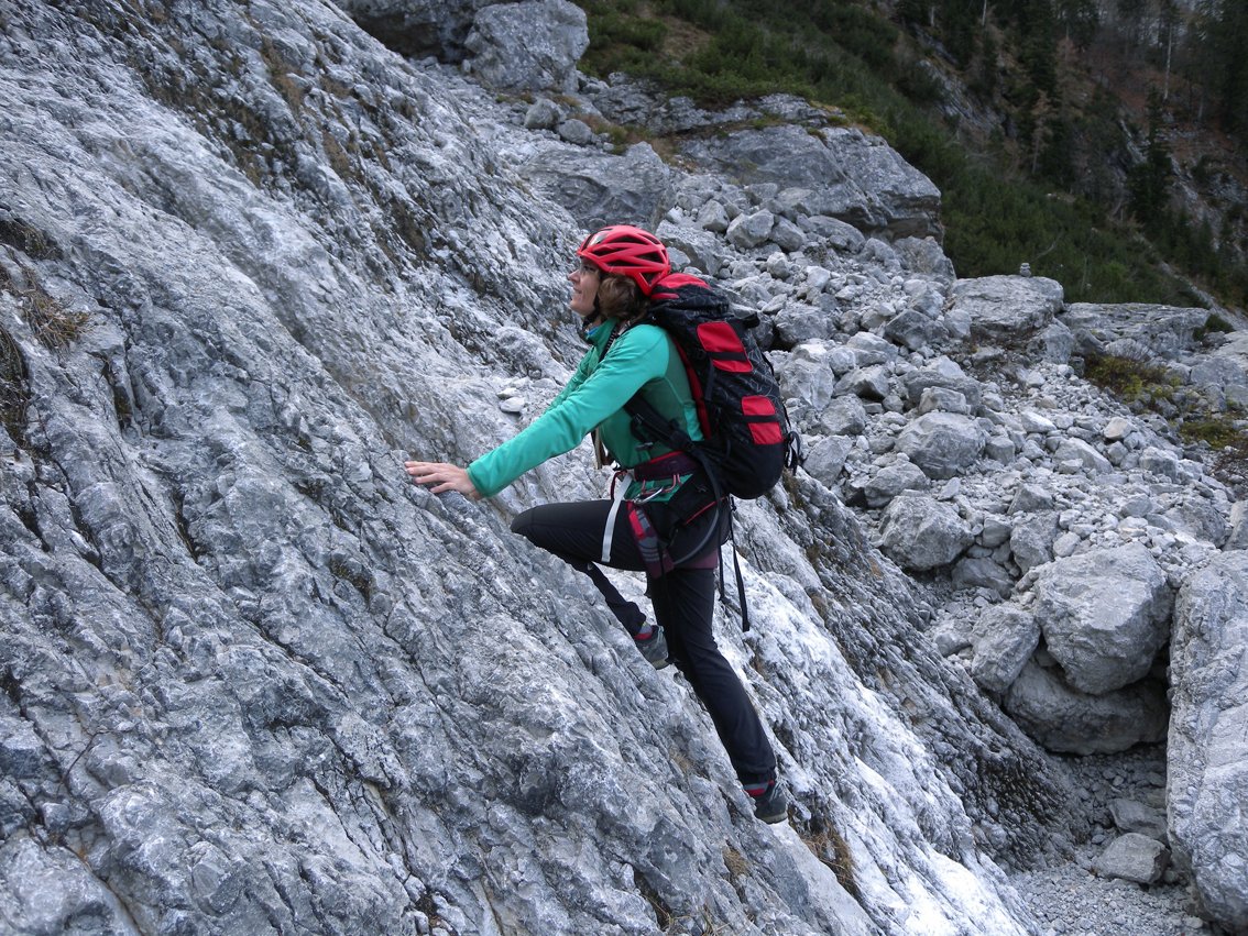 Sehr nett hergerichtete Übungsklettertour in wilder Umgebung am Fuß der mächtigen Nordwestwand der Kleinen Halt. Die Tour verläuft unten in einem Bachbett, oben dann über teilweise plattigen Fels. Für Einsteiger gut machbar, man sollte sich von den ersten glatten Metern nicht abschrecken lassen.