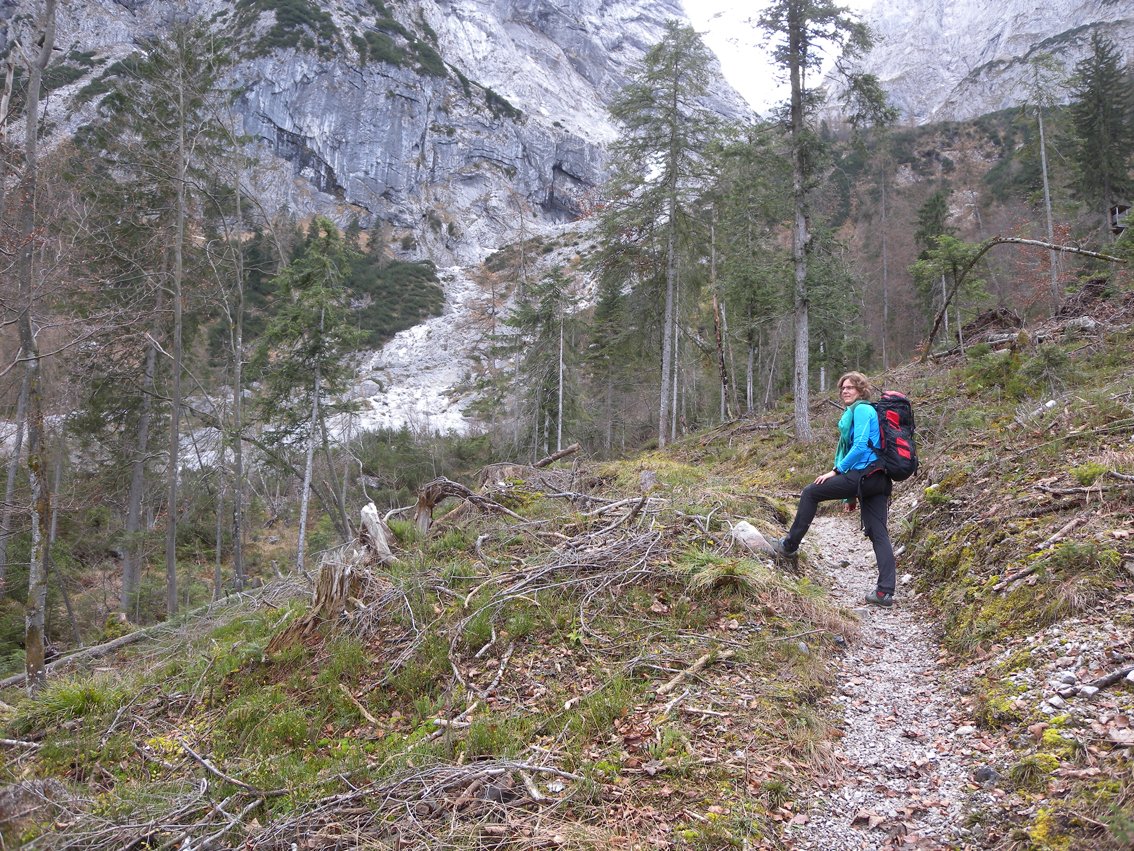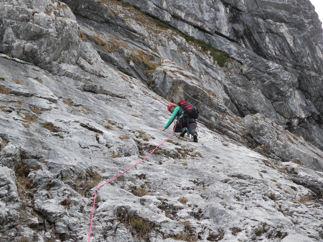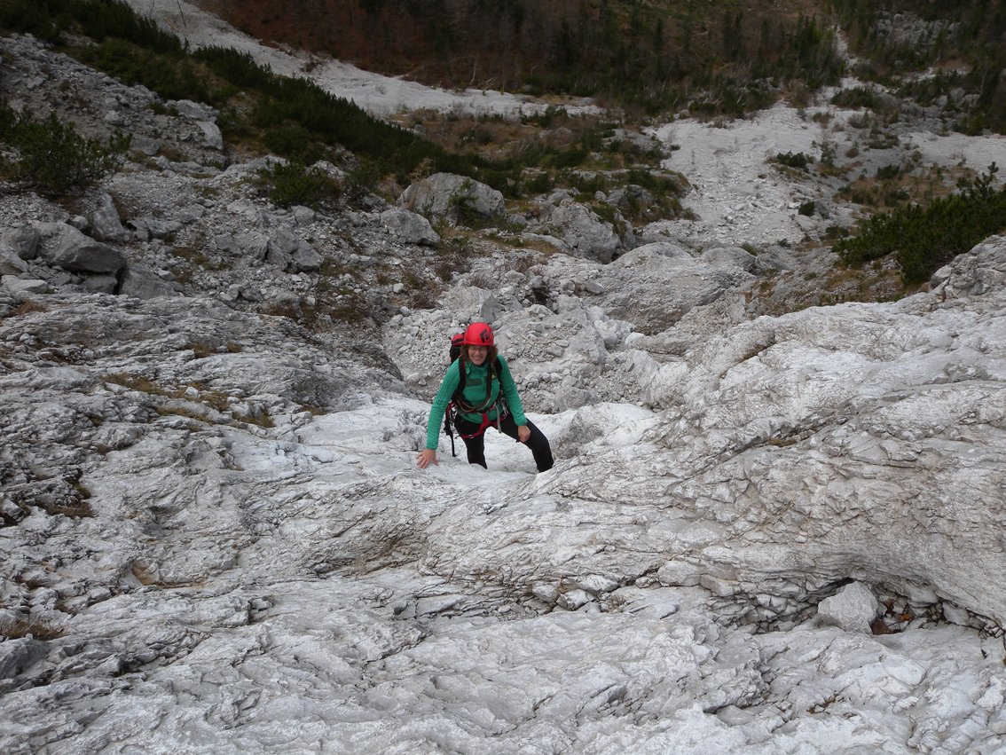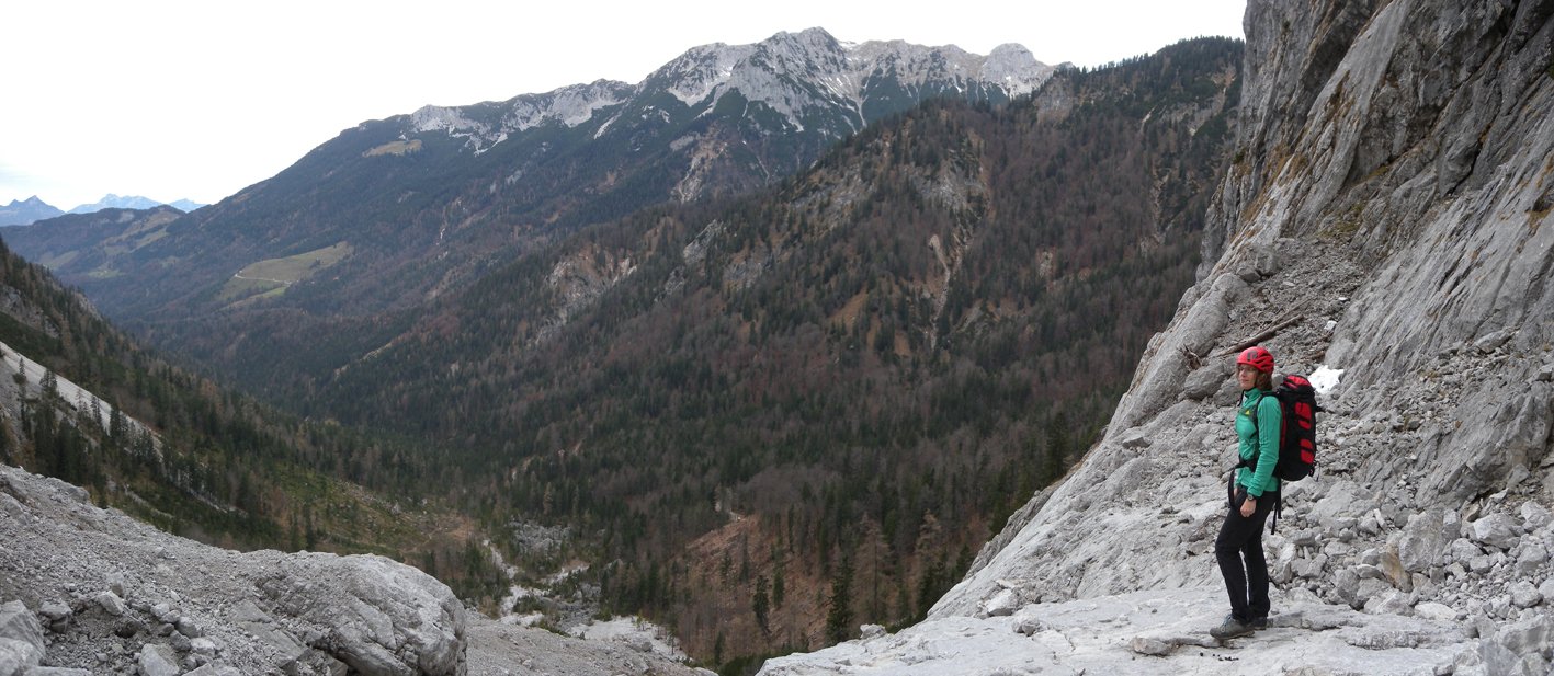 Sehr nett hergerichtete Übungsklettertour in wilder Umgebung am Fuß der mächtigen Nordwestwand der Kleinen Halt. Die Tour verläuft unten in einem Bachbett, oben dann über teilweise plattigen Fels. Für Einsteiger gut machbar, man sollte sich von den ersten glatten Metern nicht abschrecken lassen.