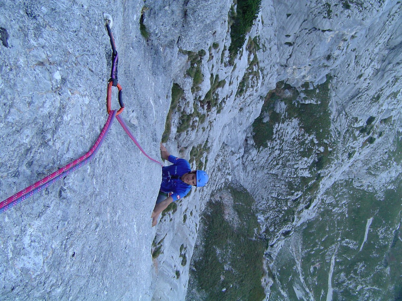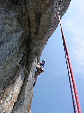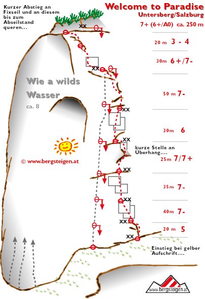 Perfekte Plattenline die an das südfranzösische Verdon erinnert. Die Route ist äußerst abwechslungsreich, die Palette reicht von gefühlvollen Plattenstellen, löchriger, steiler Kletterei bis zu einer athletischen Länge im Mittelteil. Die Schwierigkeit ist meist um 7-, nur eine Stelle ist schwerer und auch gut A0 machbar. Gehört sicher zu den besten Routen im Salzburger Raum, die perfekte Sicherung läßt Plaisirherzen höher schlagen.... (Einzig kl. Manko: die Route trocknet nach Regenfällen nur sehr langsam...)