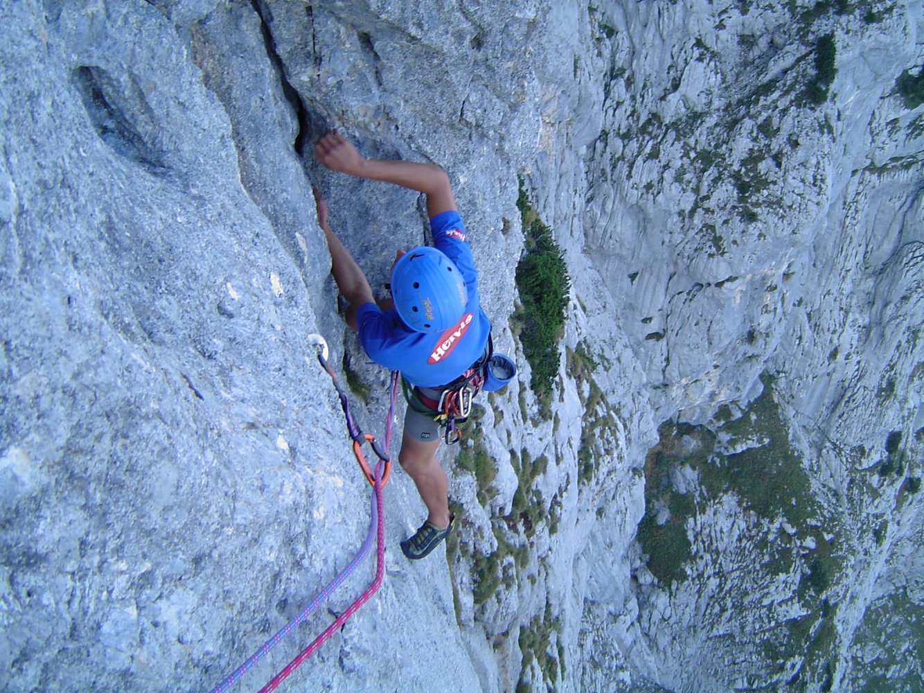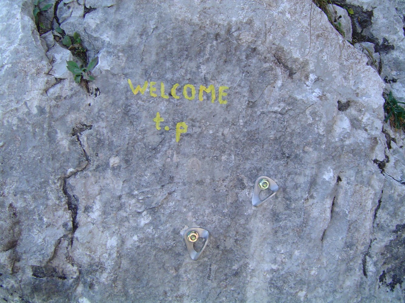 Der Einstieg ist etwas rechts von der Abseilpiste mit gelber Schrift bei zwei Bohrhaken angeschrieben.