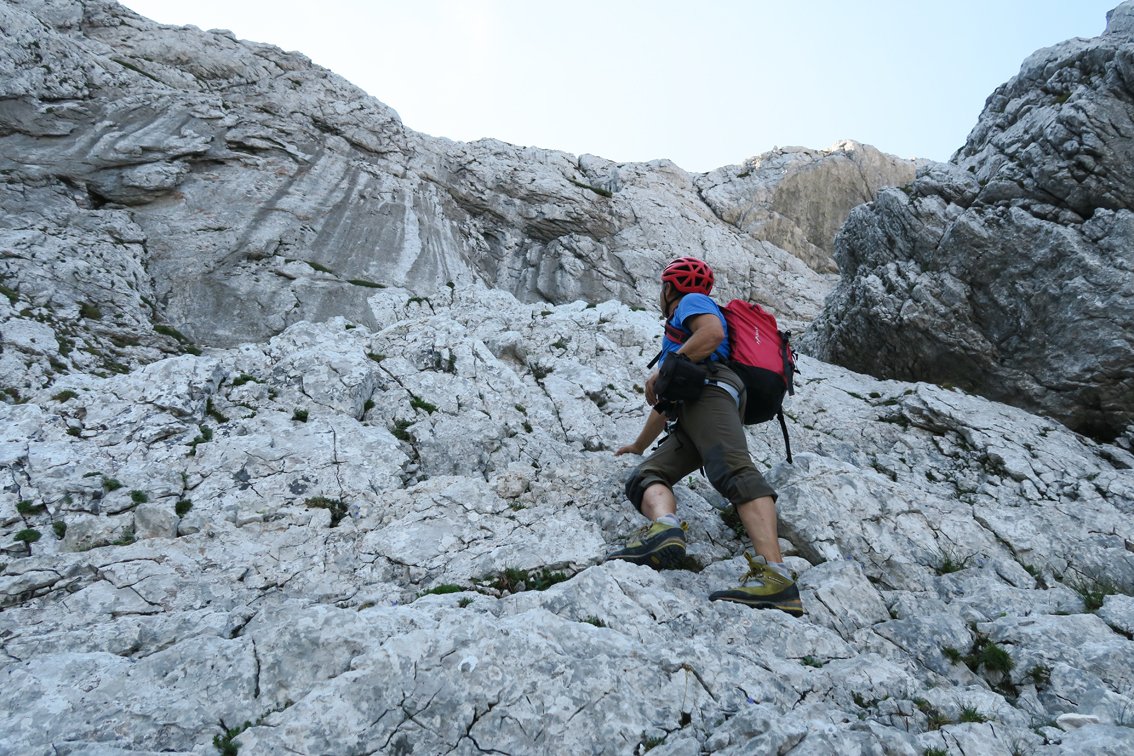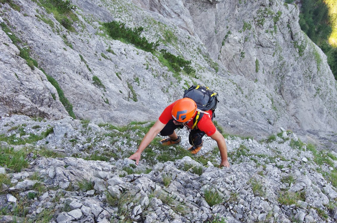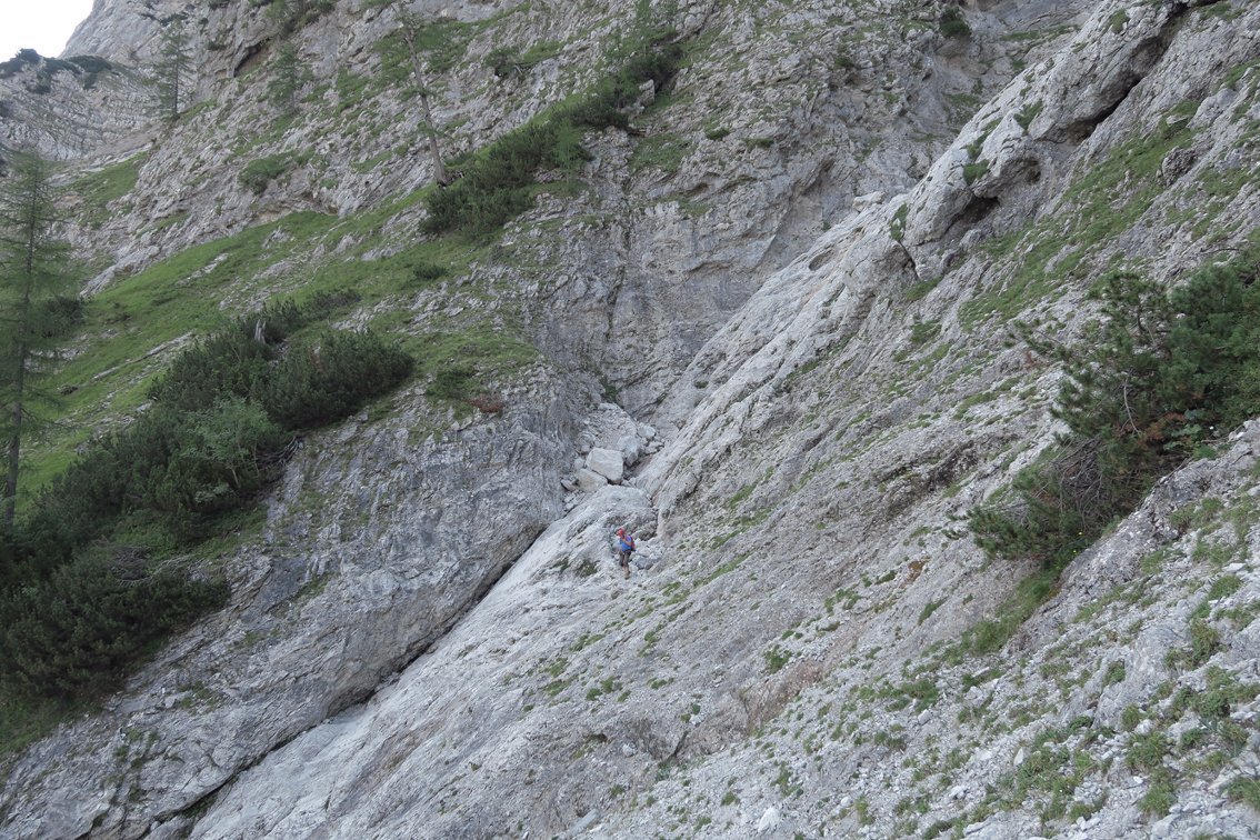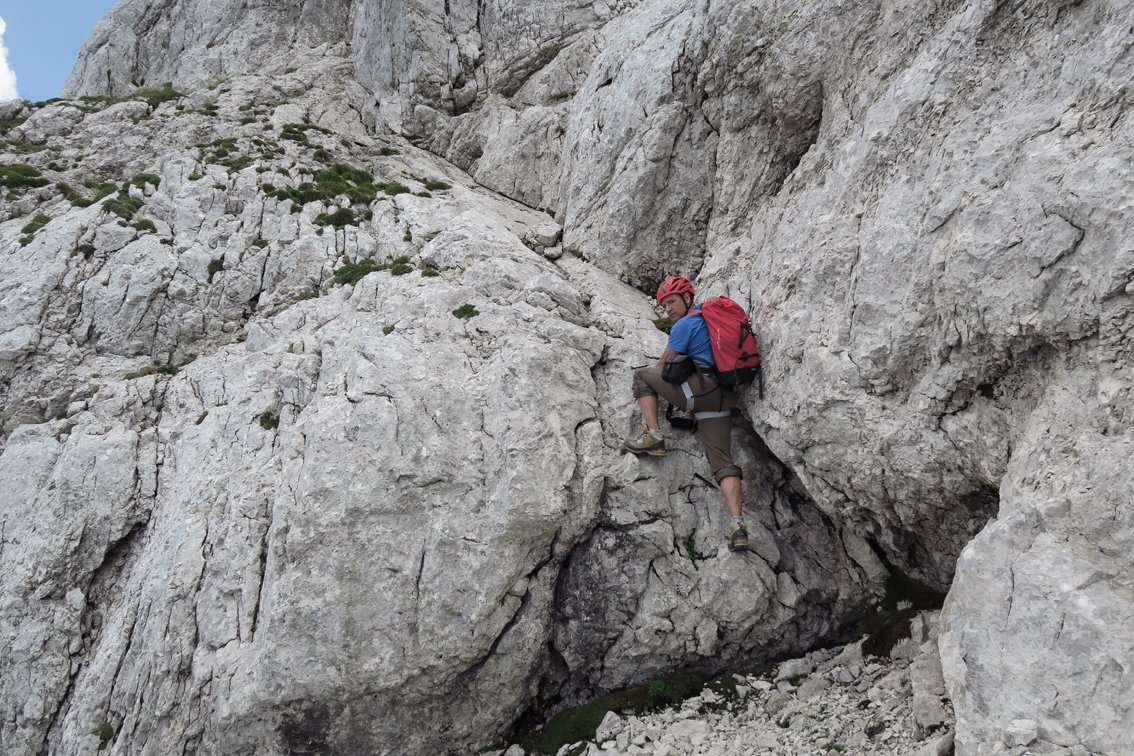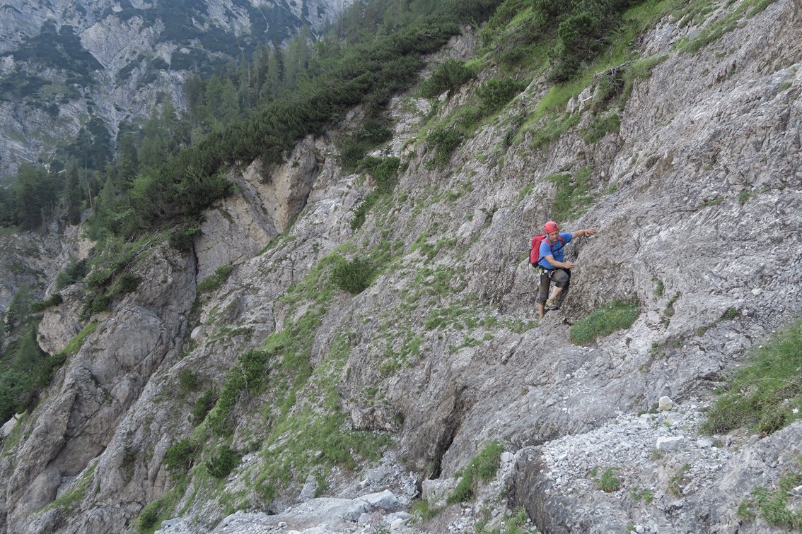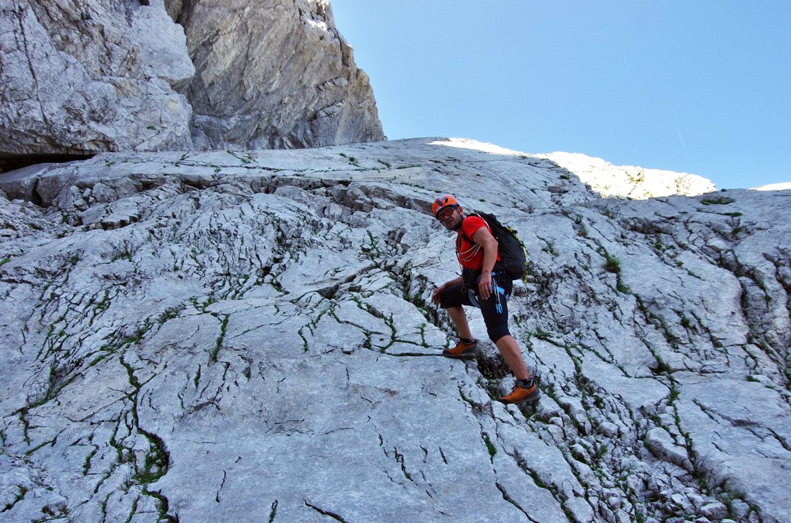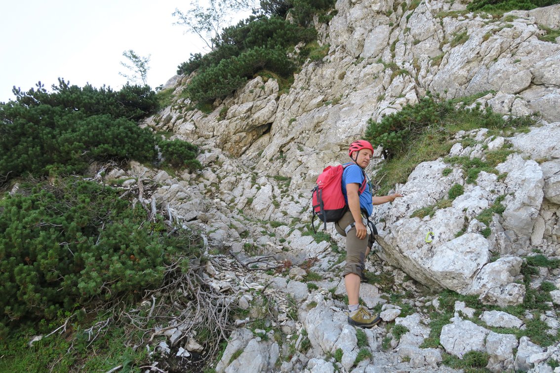 Stand August 2015: Im unteren Teil bis zum Achter-Schuttfeld sind die schweren Passagen gut mit Bohrhaken gesichert, auch im Bereich des "Achter" stecken Bohrhaken (wer genau Infos hat bitte melden, damit wir die Tourenbeschreibung ausbessern). Anm: Vor dem markanten Turm auf ca. 1650 m haben wir die BH kurz nicht gefunden, wir sind dort zu einer Latsche hinauf, dort nach links zum Turm gequert (war leicht machbar...). Vermutlich kann man auch direkter zum Turm klettern...
