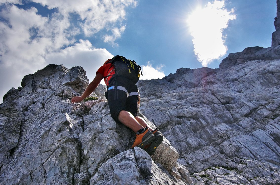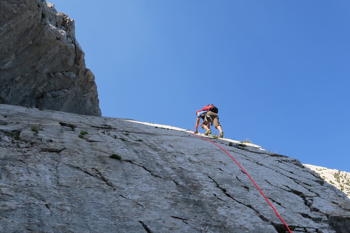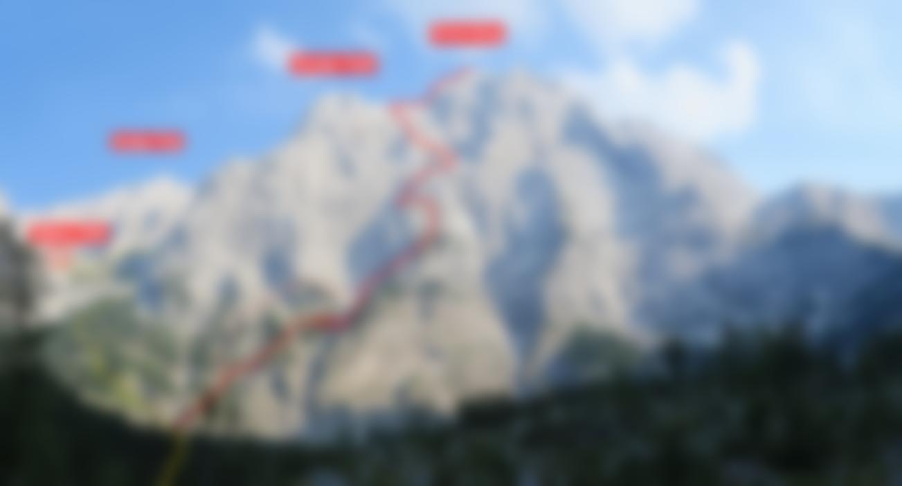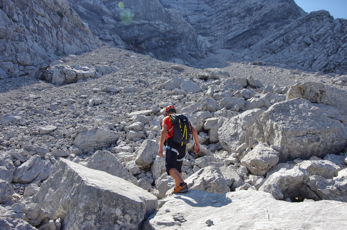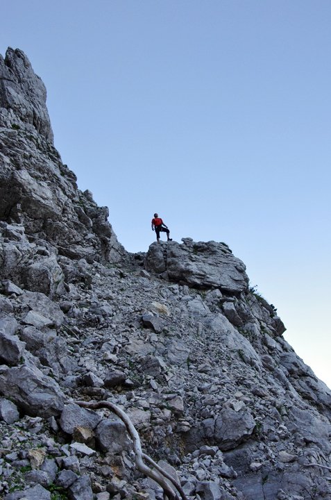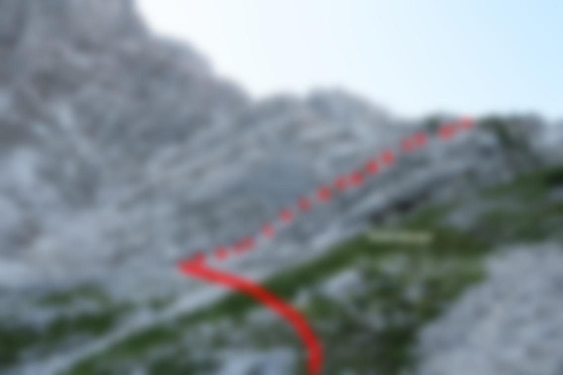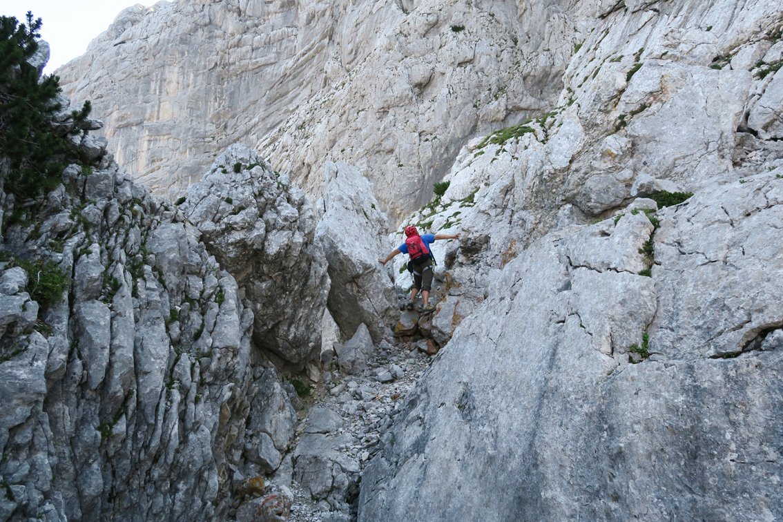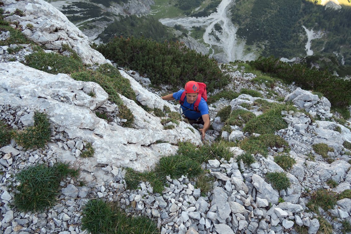Stand August 2015: Im unteren Teil bis zum Achter-Schuttfeld sind die schweren Passagen gut mit Bohrhaken gesichert, auch im Bereich des "Achter" stecken Bohrhaken (wer genau Infos hat bitte melden, damit wir die Tourenbeschreibung ausbessern). Anm: Vor dem markanten Turm auf ca. 1650 m haben wir die BH kurz nicht gefunden, wir sind dort zu einer Latsche hinauf, dort nach links zum Turm gequert (war leicht machbar...). Vermutlich kann man auch direkter zum Turm klettern...