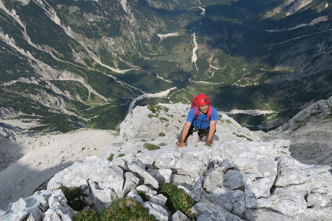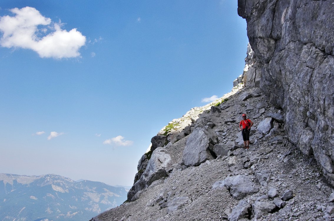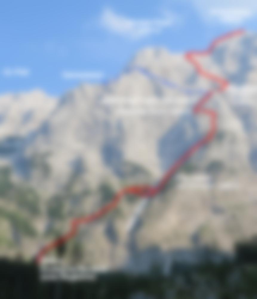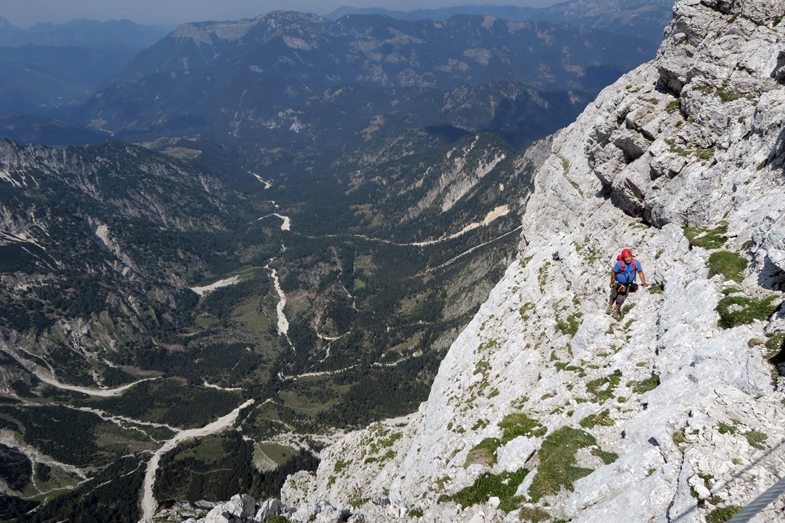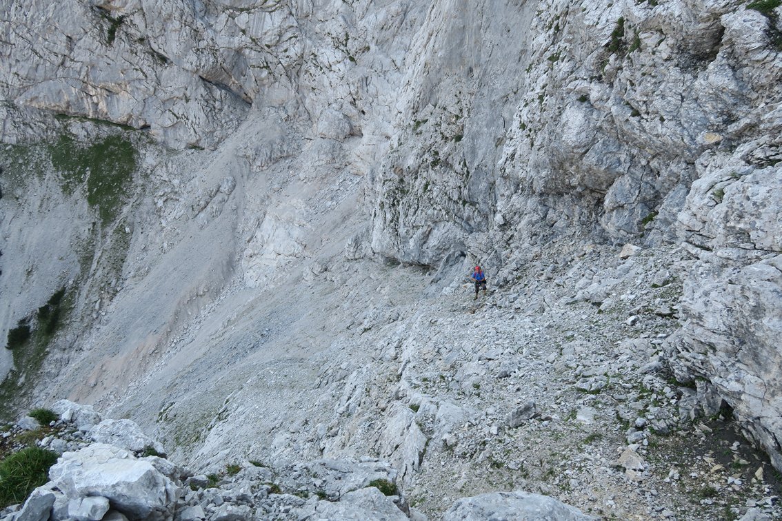 Sehr lange und trotz der Bohrhaken alpine Tour! Nur bei sehr sicheren Wetterverhältnissen in die Wand einsteigen. Bei Schneelage (auch oben auf dem Plateau) ist die Tour nicht zu empfehlen. Beim großen Schuttfeld im oberen Teil, dem sog. Achter kann man nach links zur Welser Hütte flüchten (tlw. etwas heikles, brüchiges Gelände). Die Tour wurde bis zum Achter-Schuttfeld auf weite Strecken mit Bohrhaken durchgesichert, der obere Teil wird vermutlich auch irgendwann mit Bohrhaken ausgestattet werden. Man findet die Haken aber im leichten Gelände nicht immer.... Achtung: Für den Zustiegsweg bis zum Materialaufzug würde sich ein Mountainbike sehr gut eignen (flache Forststraße), das Fahrradfahren ist aber ab dem Almtalerhaus strengstens verboten. Strafen bis zu 800 Euro sollen schon verhängt worden sein. Weiters ist die Straße zum Almtaler Haus vom 15. September bis zum 15. Oktober wegen der Jagd gesperrt, auch die Welser Hütte muss in dieser idealen Kletter- und Wanderzeit schließen! (Jagdsperre Hetzaustraße)