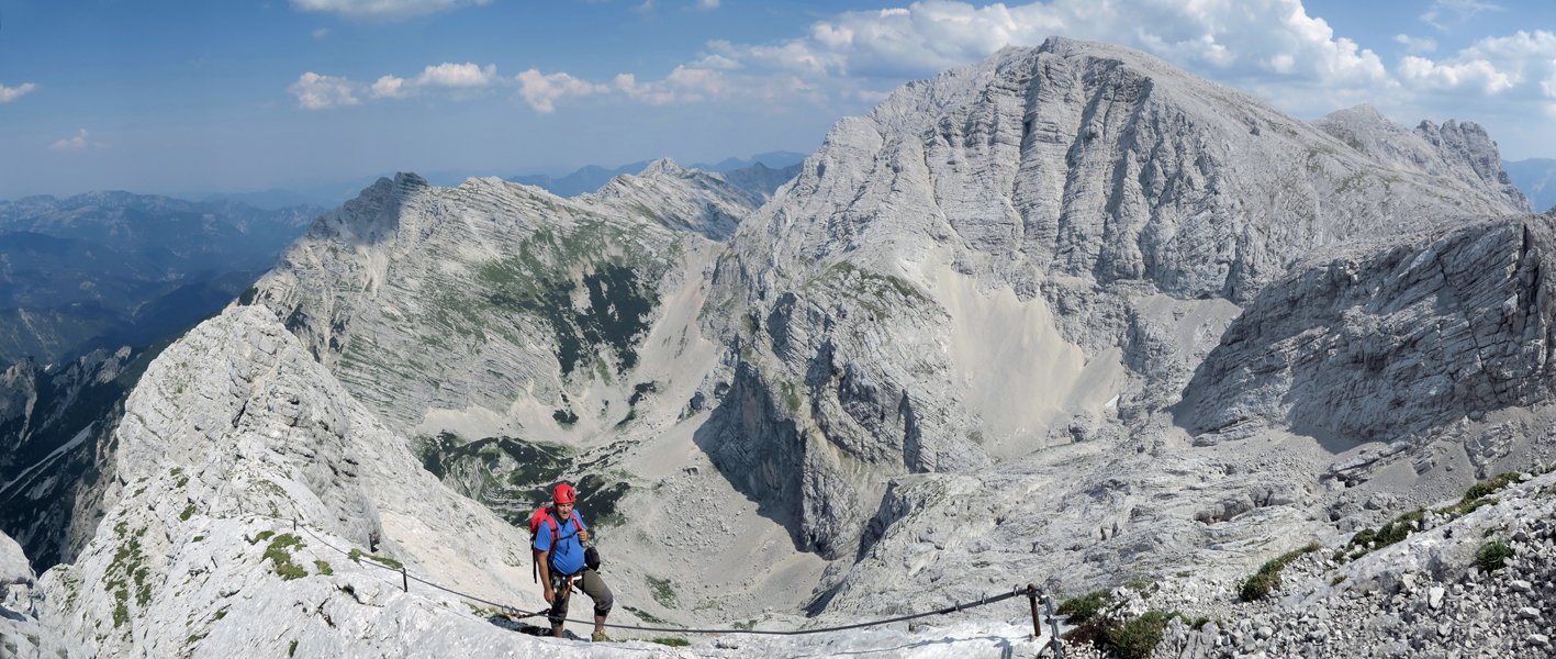 Die Nordwand des Schermberges gehört mit ihren 1400 Metern zu den höchsten Wänden der Nördlichen Kalkalpen, der Vergleich mit einer Watzmann Ostwand oder einer Hochstadel Nordwand drängt sich auf. Der Welser Weg schlängelt sich geschickt durch den linken Teil dieser gewaltigen Wandflucht, steile Passagen werden immer durch leichte Bänder überwunden bzw. umgangen. Es gibt nur wenige Passagen im 3ten Grad, oft ist das Gelände leichter bzw. man gelangt auf Pfadspuren zu Fuß höher. Im oberen Teil kann man auf dem großen Schuttfeld, dem sogenannten "Achter" noch einmal verschnaufen, danach klettert man an einem Grat und steigt am Ende auf dem Klettersteig zum höchsten Punkt. Nach dem fantastischen Blick auf die Karstlandschaft des Toten Gebirges folgt der doch recht lange Abstieg, vorbei an der Welser Hütte, hinunter zum Almtaler Haus. Am späten Nachmittag kann man von der Hüttenterrasse noch einmal zur mächtigen Nordwand blicken und hat die Gewissheit und ist vielleicht sogar etwas stolz, eine der höheren Ostalpen-Nordwände bezwungen zu haben.