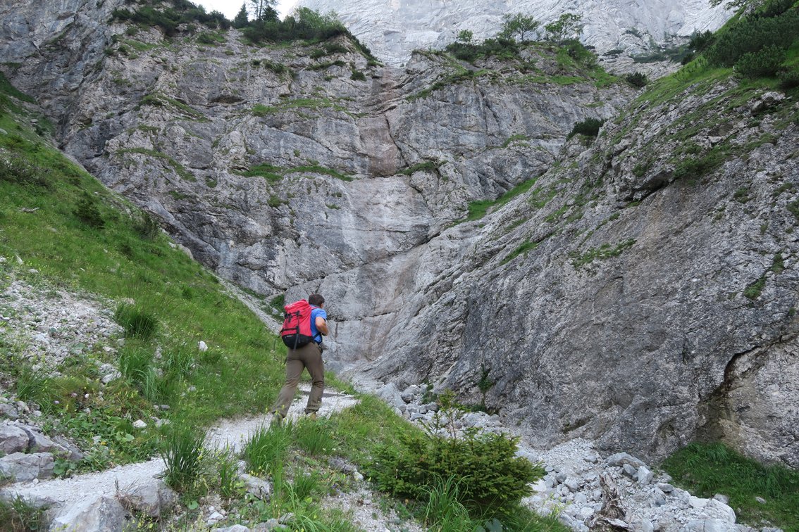 Vom Almtaler Haus folgt man dem Weg in Richtung Welserhütte. Kurz nach der Materialseilbahn steigt der Weg etwas an, man kommt in ein Bachbett und verlässt den Weg bei der ersten Kehre. Ein paar Schritte das Bachbett hinauf zu Ringhaken an der rechten Wand.