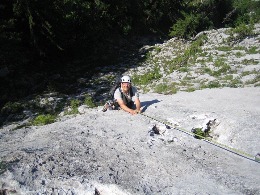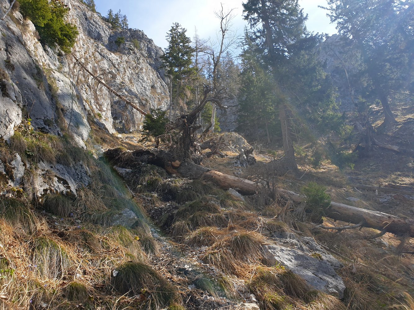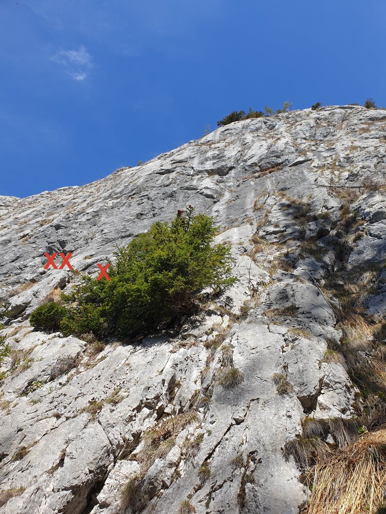 Am besten Abseilen über die Route und auf dem Zustiegsweg zurück ins Tal. Alternativ kann man auch auf Steigspuren etwas höher hinauf und dann oben nach rechts zum Naturfreundesteig queren (siehe Karte).