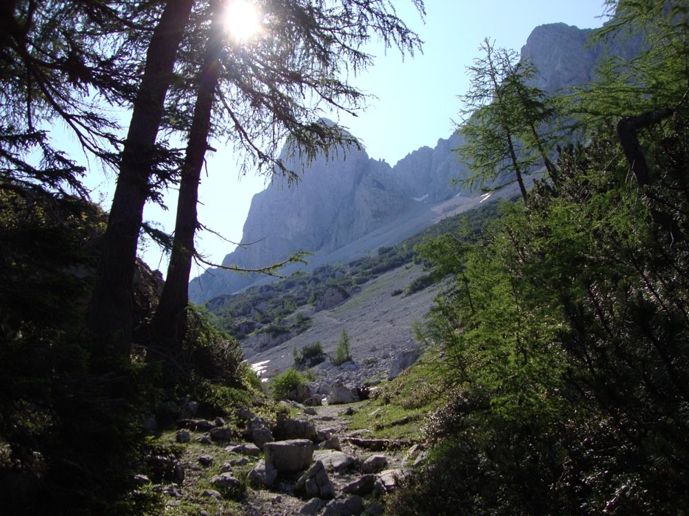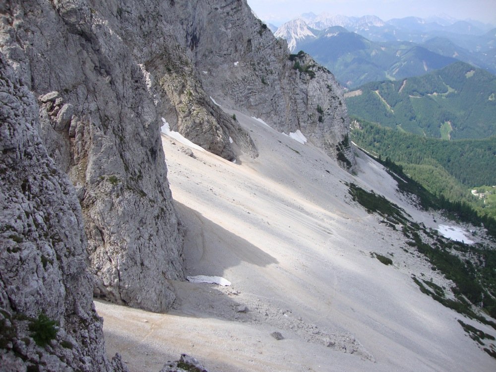 Vom Ausstieg 10m zum markierten Steig und auf diesem (5-10min) nach Westen absteigen bis zu einer Scharte. Einige Meter aufwärts zum Beginn des ÖTK- Klettersteigs bei einer blauen Tonne. Über den Klettersteig (B bzw. B/C) hinab und über das Schotterfeld zurück zum Einstieg. Weiterer Abstieg: wie Aufstieg.