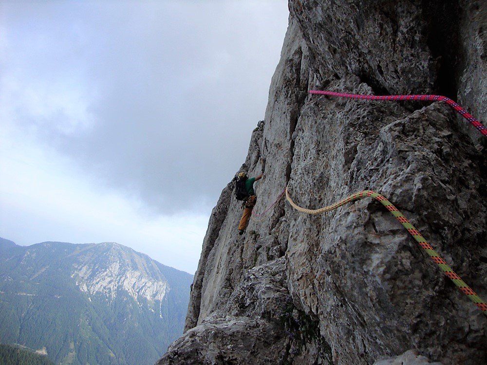 Die Westkante wurde früher meist in Kombination mit dem Oberen Quergang begangen. Um die Tour um 2 schöne Längen zu erweitern, wird hier die Variante über den Unteren Quergang beschrieben. Die Route ist diejenige am Koschutnikturm, die den alpinsten Charakter in den unteren Schwierigkeitsgraden aufweist. An den schwersten Stellen sind Zwischensicherungen gebohrt, dazwischen stecken Normalhaken bzw. ist mit mobilen Sicherungsmitteln selbst zu arbeiten. Sie eignet sich ideal für Kletterer, die etwas Erfahrung bei Mehrseillängenrouten haben und nun den Schritt in alpines Gelände wagen wollten.