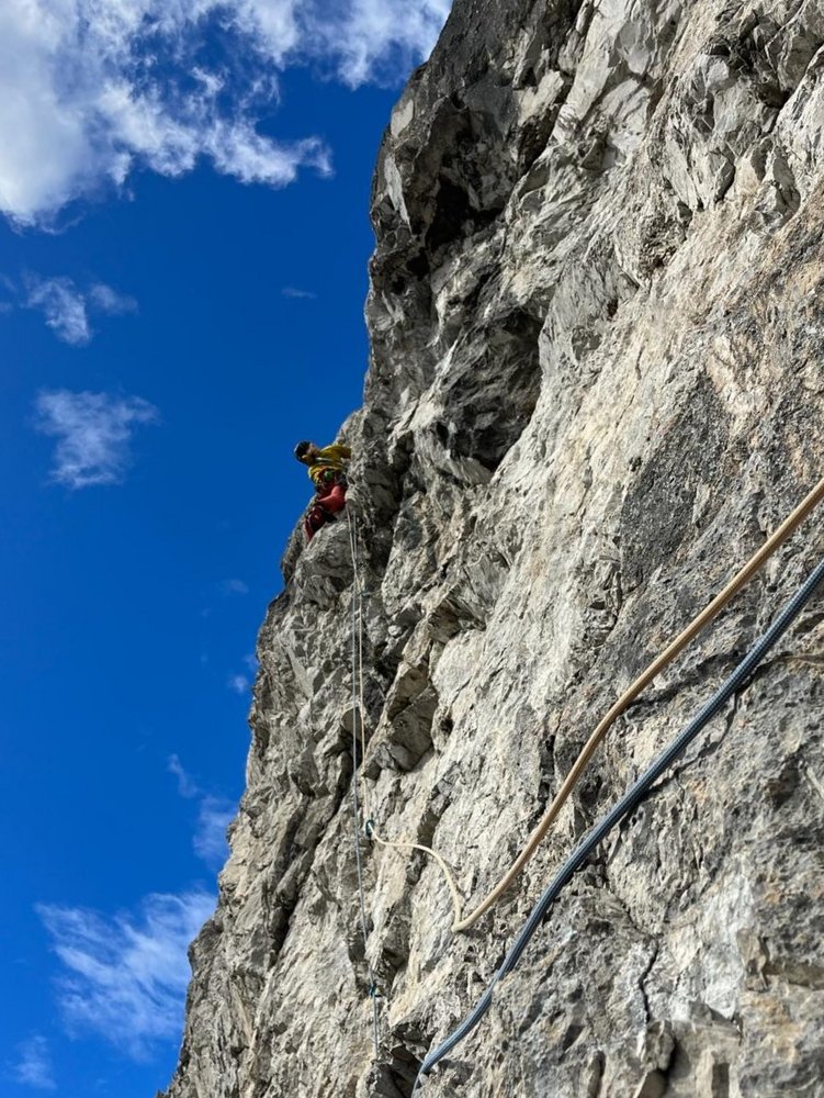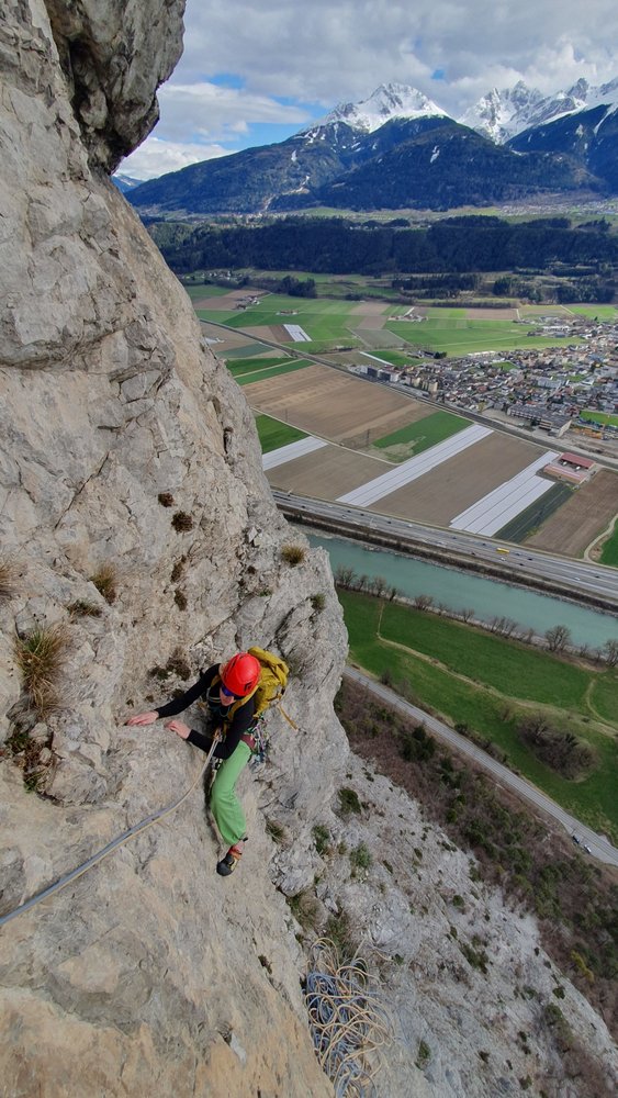 Es wurden im Topo sowohl die originalen technischen Schwierigkeiten aus dem AV-Führer 1984 (6, A2), als auch die Freikletterbewertungen (wahrscheinlich) von der ersten Rotpunktbegehung nach Würtele A. in "Innsbruck Rock" 2023 und unsere Vorschläge veröffentlicht. Die Schwierigkeitsangaben sind ähnlich variabel wie der Fels.