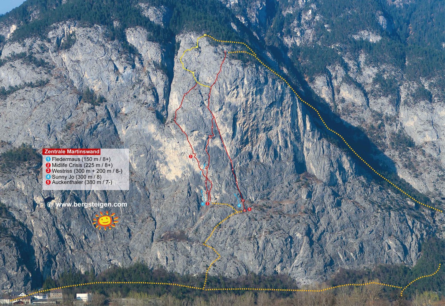 Am besten Start am Parkplatz des AV-Klettergartens und der Beschilderung zu den Vorbau-Routen folgen. Dort wo man den Sammelabstieg nach links zur wenige Meter entfernten Wand verlässt, Depot. An der Wand entlang auf und ab an allen bekannten und unbekannten Vorbaurouten, weiter an einem aufgegebenen Sportklettersektor und der rot angeschriebenen "Emilia lacht" vorbei, bis man an 2 Gedenktafeln und in verblasst rot angeschrieben der "Julia lacht" steht. Hier mit etwas Gefühl dem Speck und verblassten roten Markierungen über Schrofengelände in Richtung "Auckenthaler". Kurz davor am Einstieg der "Sunny Jo" (Gedenktafel für Jo Luger und Kebehaken-Reihe gerade hoch) auf Band nach links, vorbei am 1. Standplatz der "In Memoriam Stefan bis zu einem Baumbestandenen Absatz. Hier geht in grasiger Verschneidung nach rechts der "Zirler Einstieg" zur "Auckenthaler" weg, gerade hoch bei Bohrhaken der "Midlife Crisis" eher unscheinbar der "Westriss".