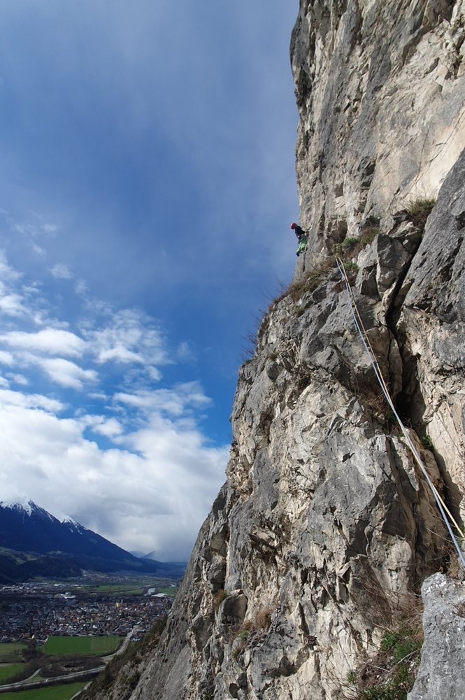 1990: Im Rahmen der 1. Rotpunktbegehung wurde laut Würtele A. in "Innsbruck Rock" 2023 insgesamt an 3 Standplätzen jeweils ein Kronenbohrhaken gesetzt. Der Kronenbohrhaken an unserem 3. Standplatz (nach der Schlüssellänge) wurde durch einen neuen Klebering ersetzt. Fun-Fact: Das ist einer der ganz wenigen Standplätze an denen zum einen das vorhandene Material noch eher gut ist und zum anderen mit 2 Totem Cams innerhalb von Sekunden ohne großartige Skills ein bulletproofer Standplatz aufgebaut werden könnte.