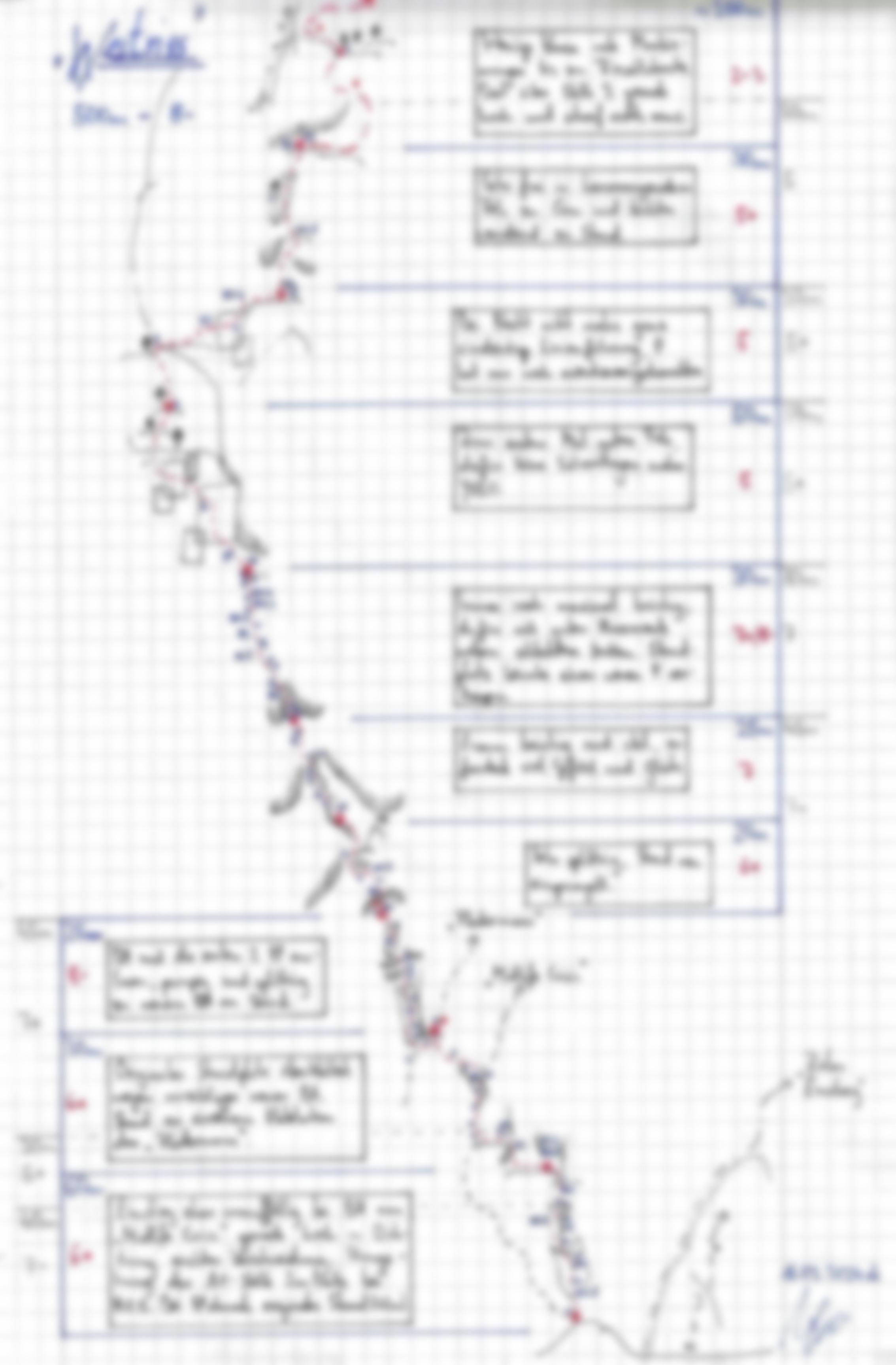 1. leicht rechts halten über Kletterei im 3. Grad und später einfacher werdend auf ein Schotterband. Hier bei einem kleinen roten Punkt über kurzen kompakten Fels nach links queren und wieder rechts ansteigend in Gehgelände zu einem Schotterband mit einzelnen mittelgroßen Bäumen.