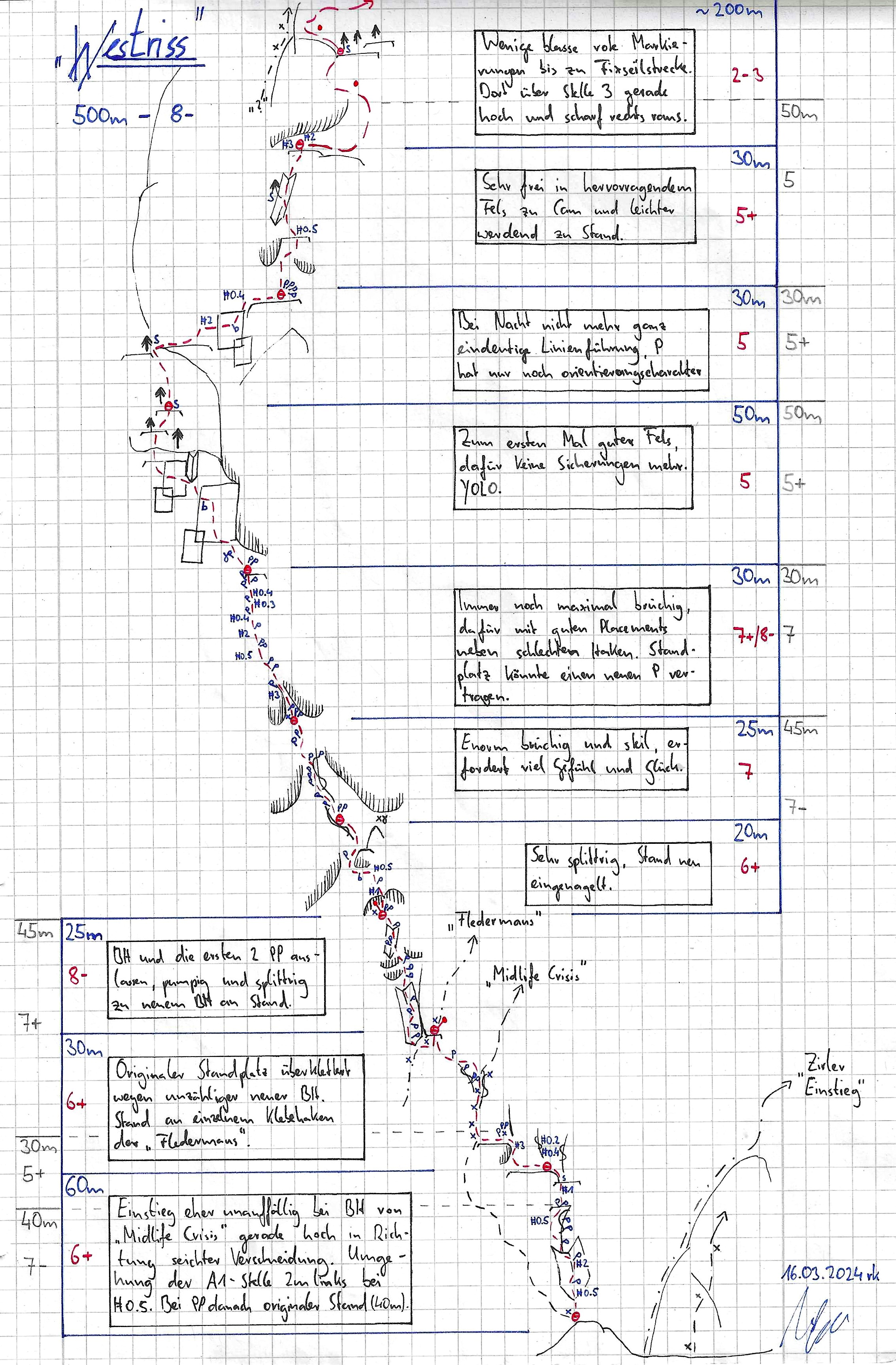 Es ist zu erwarten und hoffen, dass aufgrund des hohen Putzaufwands vorerst keine Veränderungen mehr am "Westriss" zu Gunsten einer weiteren Plaisirtour entstehen werden, wenngleich bereits 2024 eine (vollkommen eigenständige) Fixseilstrecke links des originalen Ausstiegs der "Auckentahler" mit neuen Bohrhaken verläuft.
