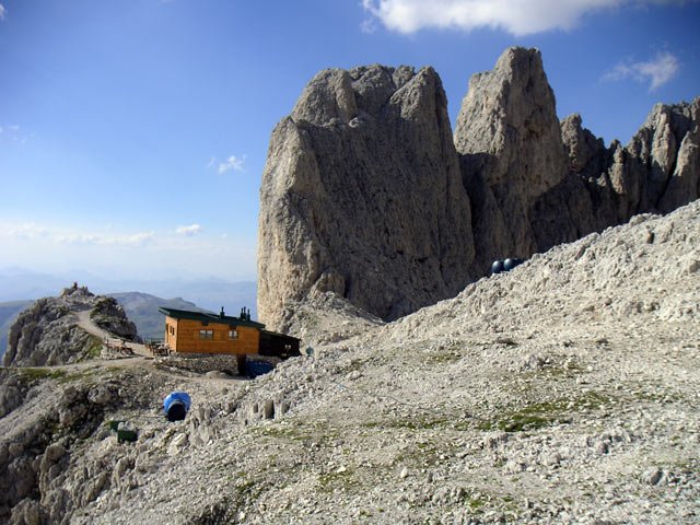 Zustieg zur Santnerpasshütte: Von Vigo di Fassa mit der Catinaccio-Seilbahn zum Rif. Ciampedie (1997 m) und über die Gardecciahütte (1956 m) in 1,5 Std. zur Vajolethütte (2234 m). (Alternativ: Bustaxi von Pera di Fassa zur Gardecciahütte, von dort in 45 Min. zur Vajolethütte.) Von hier 1 Std. zur Gartlhütte (2621 m) und weitere 20 Min. zur Santnerpasshütte (2734 m). Alternativ: Über die Rosengartenhütte, teilweise versichert, zur Santnerpasshütte.