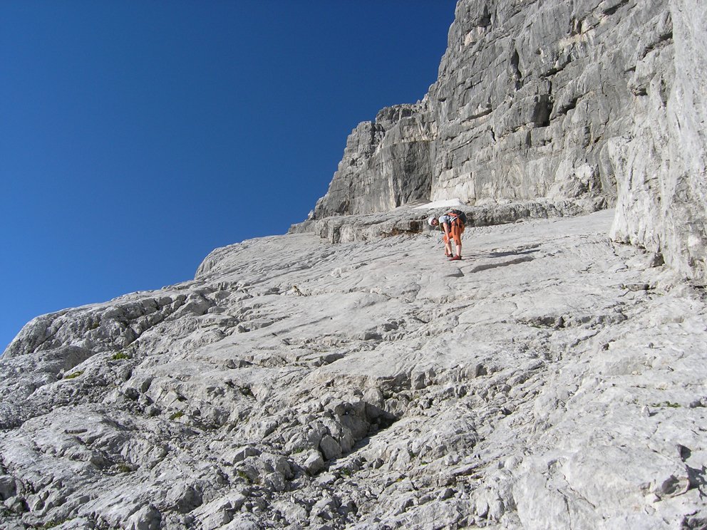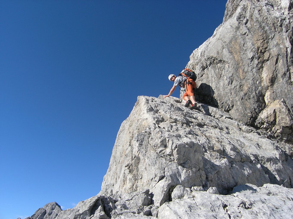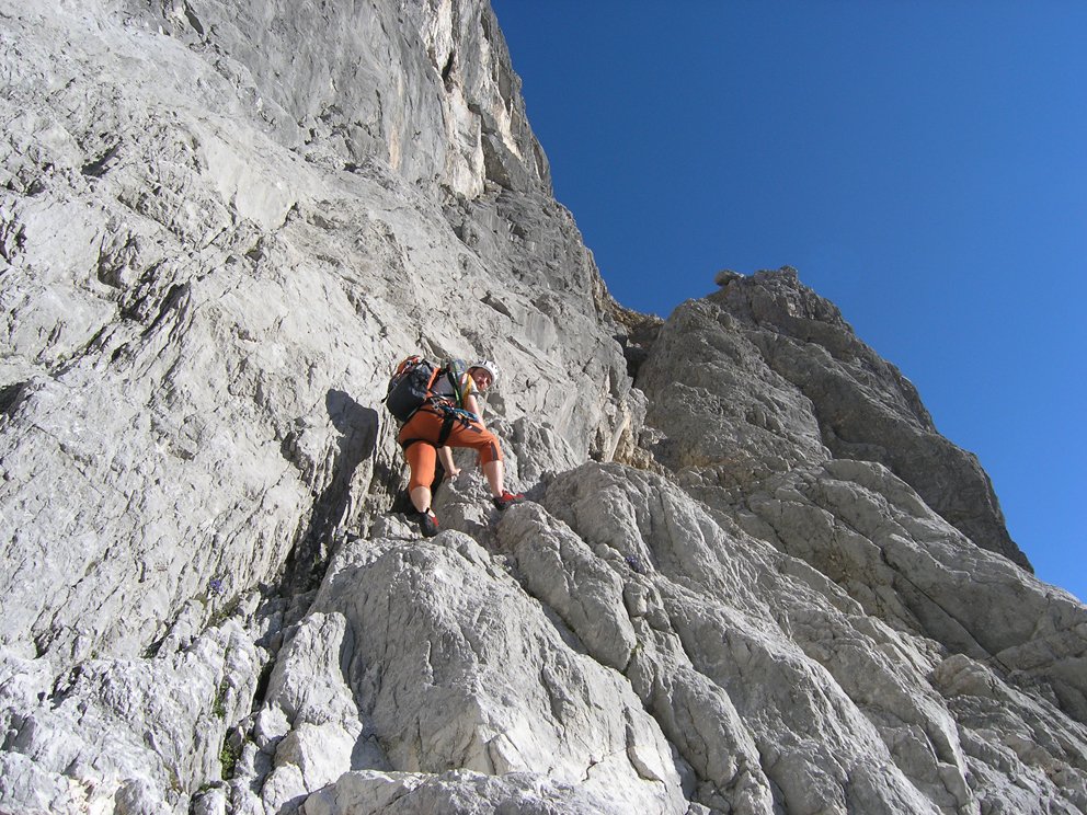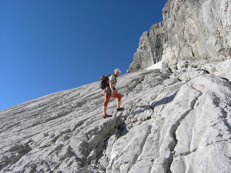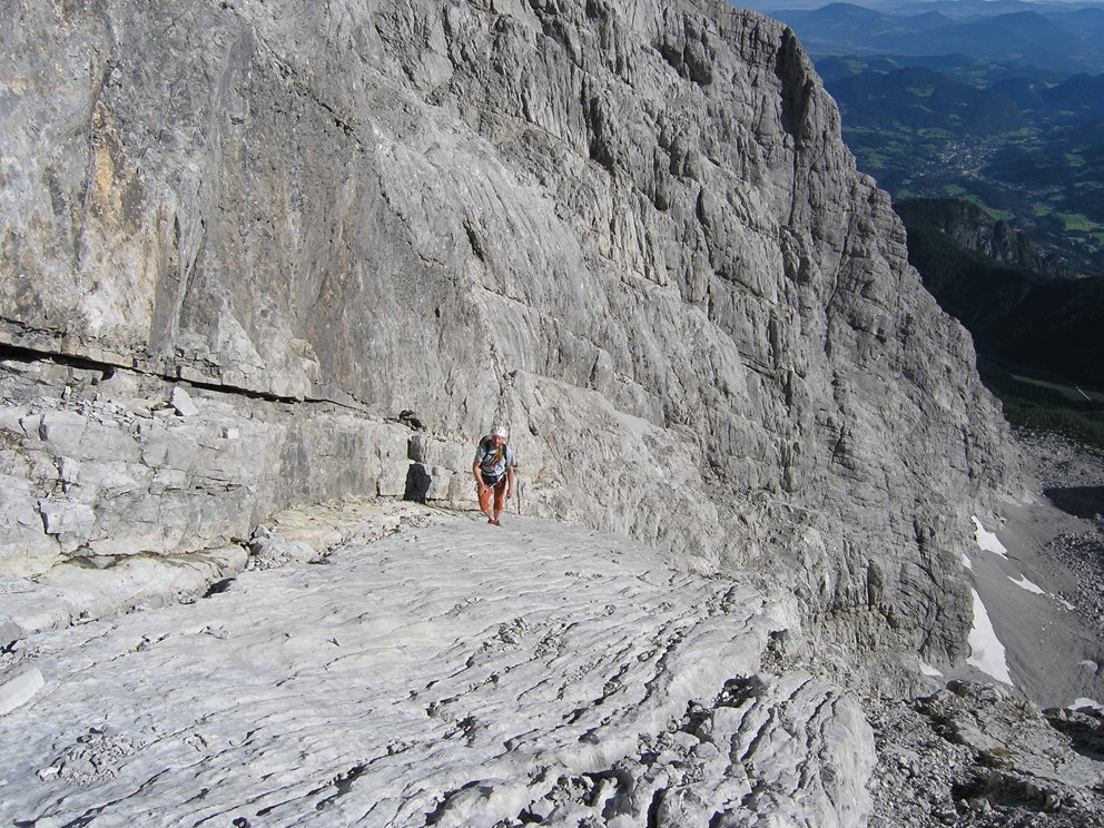 Schöne ansprechende Route, die sich ideal als Vorbereitung für die große Watzmann Ostwand eignet. Landschaftlich sehr eindrucksvoll, das Wiederband ist tlw. autobahnbreit, man weiß nicht wirklich ob man gehen oder klettern soll. Gewisser Spürsinn in der Routenfindung ist trotz der roten Punkt- und Steinmannmarkierung gefragt. Auf Bändern und Platten geht es durch die mächtige Wand. Ideal auch in Kombination mit dem Mountainbike als üppige Tagestour machbar. Vom oberen Abschnitt hat man einen eindrucksvollen Blick in die "große" Ostwand unter der Südspitze.