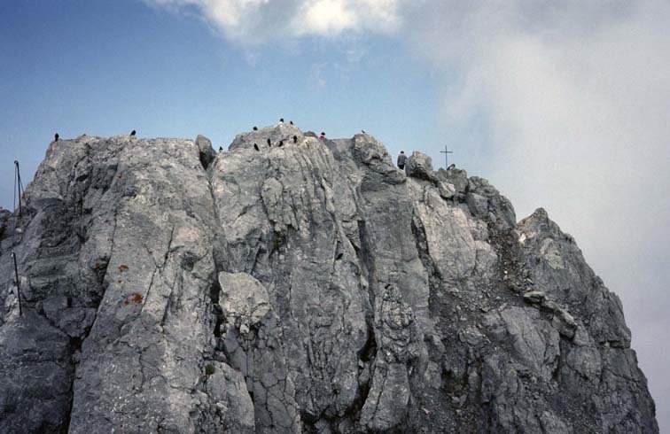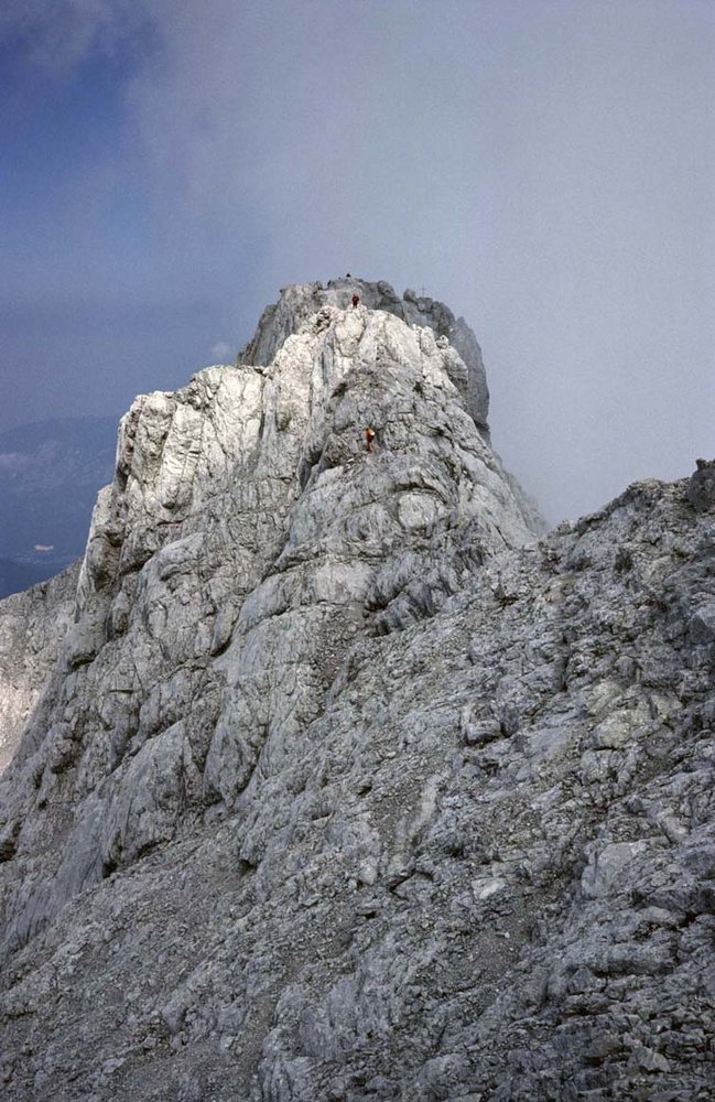 Zuerst durch die oben etwas gelbe Rinne aufwärts (zwei kurze Steilstellen 3-, meist 1 - 2), dann rechts querend (1-) bzw. leicht absteigend zum Beginn des Wiederbandes. Das Band links haltend aufwärts (zwei steilere Stufen 3-, sonst Gehgelände) bis zum 5 m hohen Pfeiler, dem sog. „Bandwächter“ (Wandbuch auf der Rückseite). Direkt hinter dem Pfeiler eine Rinne zu einem Felsenfenster aufsteigen (Stelle 3-, roter Punkt am Beginn der Rinne) und dem breiter werdenden Rinnenband leicht rechts haltend folgen (1 - 2). Kurze, leichte horizontale Rechtsquerung (1) auf einem schmalen Band vor einer sperrenden Steilstufe, dann wieder leicht links haltend zum unteren der zwei Querbänder (1 - 2) die aus der Rinne nach links ziehen. Auf dem unteren Band (rote Punkte, 1 - 2) bis zu einer Kante, dort wird das Band plötzlich sehr schmal. Nur ganz kurz (ca. 10 m 1 - 2) dem schmalen ausgesetzten Band folgen, dann sofort hinauf durch eine Rinne (roter Punkt, anfangs kurz 3-) und dann leicht links (1 – 2) haltend weiter zu einer griffigen kurzen Wandstufe (3-). Danach immer links haltend den Bändern (Steinmänner, rote Punkte) bis zu einer Rinne zwischen Gipfel und Watzmanngrat (mit Drahtseilen versichert) folgen. Entweder direkt durch die Rinne (Schotter, ungut zu gehen, Stelle 2+) oder rechts davon (fester Fels, Stelle 3-) bis zum Gipfel der Mittelspitze aufsteigen.