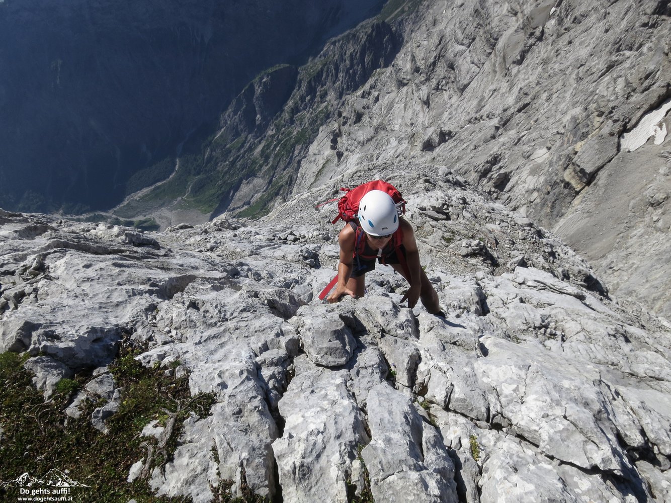 Helm, bequeme Kletterschuhe und evtl. ein 50 m Seil, Schlingen und ein kleines Kleinkeilgrundsortiment
