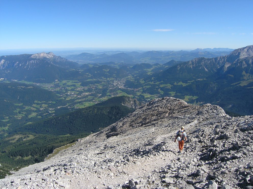 Von der Mittelspitze über den teilweise gesicherten Watzmanngrat nach Norden auf das Hocheck (Unterstandshütte). Weiter am markierten Weg durch die Watzmanngrube, am Watzmannhaus vorbei, hinunter zur Falzalm. Bei der Wegkreuzung (Wegweiser) rechts auf den Steig, welcher unter dem Watzmannkar zur Kührointhütte quert, von dieser weiter ins Tal.